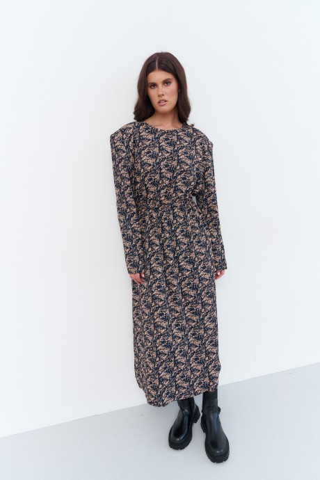 Характеристики: выполнено из плательной ткани в бежево-синий принт, по талии регулирующая сборку кулиса, по горловине спинки обработана застежка "капелька" на петлю и пуговицу, рукава одношовные. Длина платья 134 см, длина рукава 62 см.