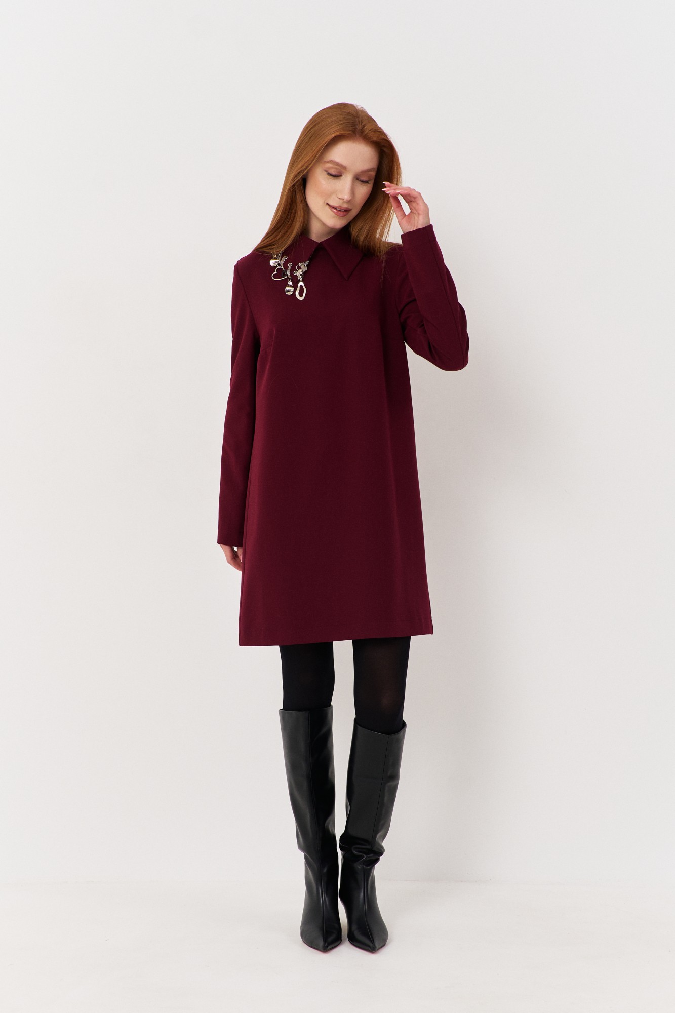 Платье прямого силуэта. Характеристики: выполнено из плательной ткани в цвете марсала, воротник рубашечного типа с декоративными подвесками, по спинке застежка-молния, рукав двухшовный. Длина платья 91 см, длина рукава 62 см.