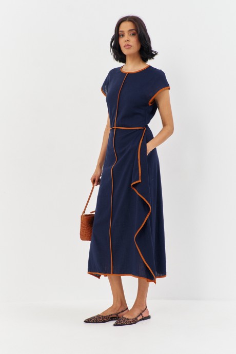 Платье прямого силуэта. Характеристики: выполнено из плательной ткани "под лен" в синем цвете с отделочными окантовками, в боковых швах карманы, спинка разрезная на потайную застежку-молнию.