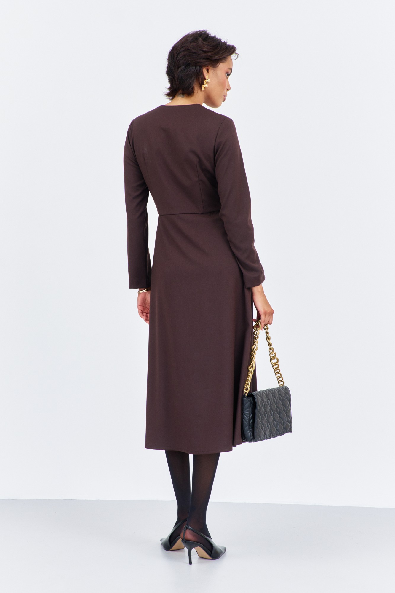 Платье приталенное на запах. Характеристики: выполнено из плательной ткани в цвете шоколад, отрезное по линии талии, по переду и спинке обработаны вытачки, по переду запах на декоративные петли и пуговицы.