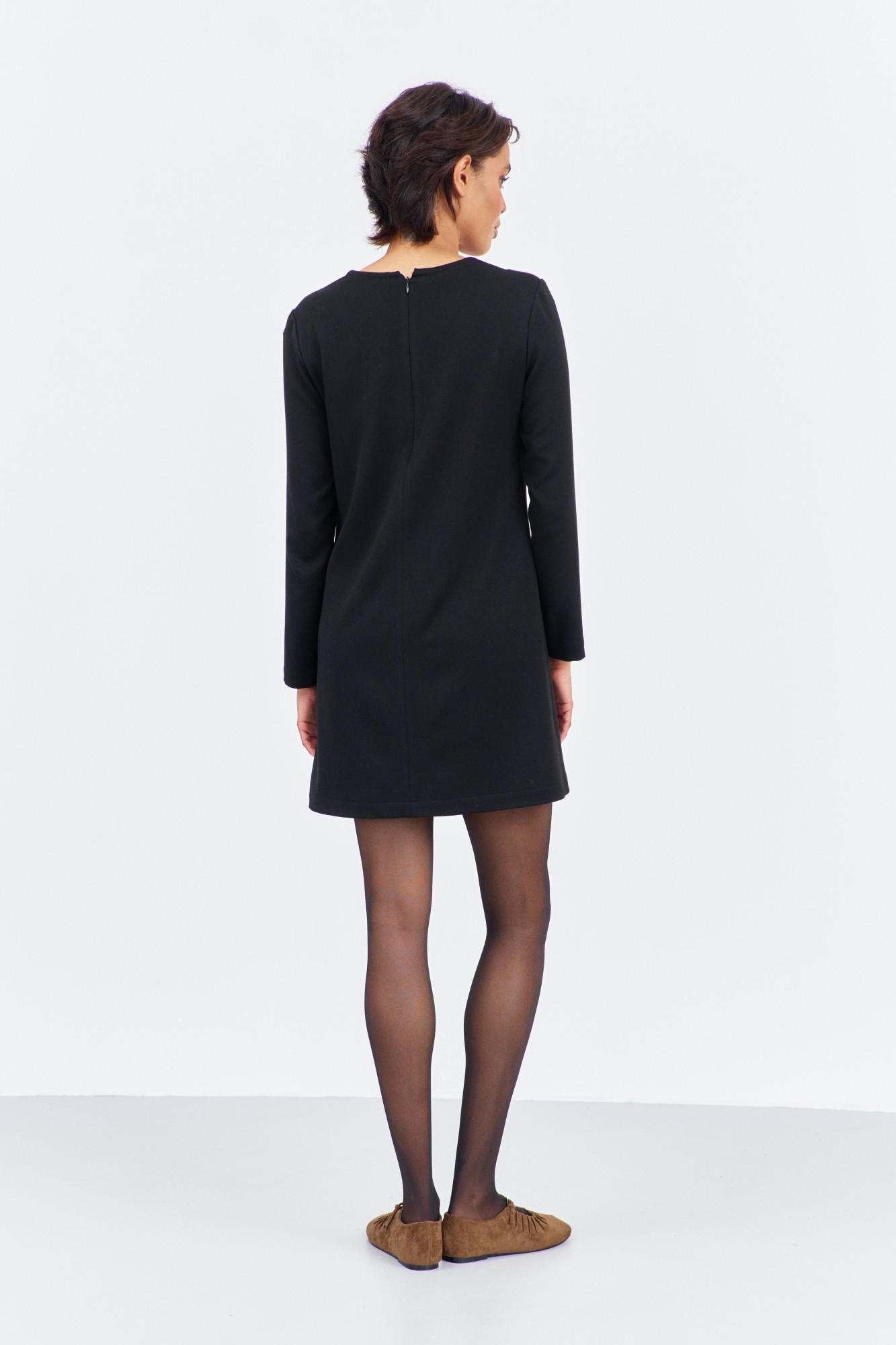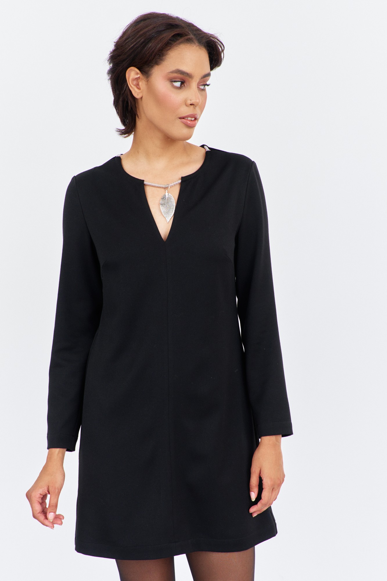 Платье прямого силуэта. Характеристики: выполнено из плательной ткани в черном цвете, по горловине переда и спинки декоративный элемент с цепочкой и подвеской, спинка разрезная на потайную застежку-молнию.