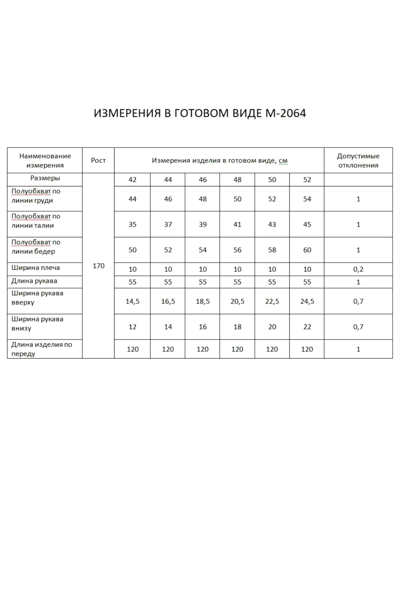 Таблица размеров