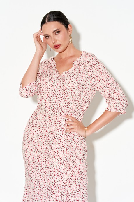 Женское летнее платье полуприлегающего силуэта выполнено из натурального полотна в приятном цветочном принте. Платье на запах с потайной кнопкой в области груди, отрезное по линии талии. По горловине и низу рукавов вставлены резинки, создающие сборки. В боковом шве платья - застежка-молния, в боковых швах - функциональные карманы, по линии талии - пояс-завязка, по низу - волан с разрезами.