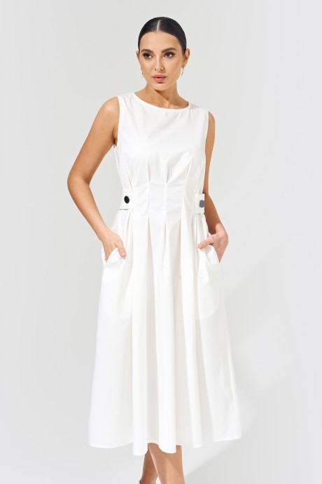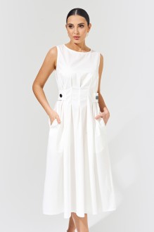 Женское платье А- силуэта с карманами в боковых швах и декоративными складками по линии талии, в которые вставлены регулируемые функциональные паты с пуговицами. Изделие выполнено из натурального гладкокрашенного хлопкового поплина и застегивается по спинке на потайную молнию. При правильном выборе белья светлое платье не просвечивает.