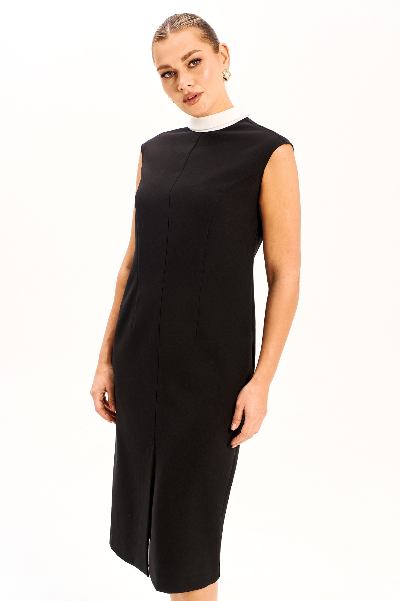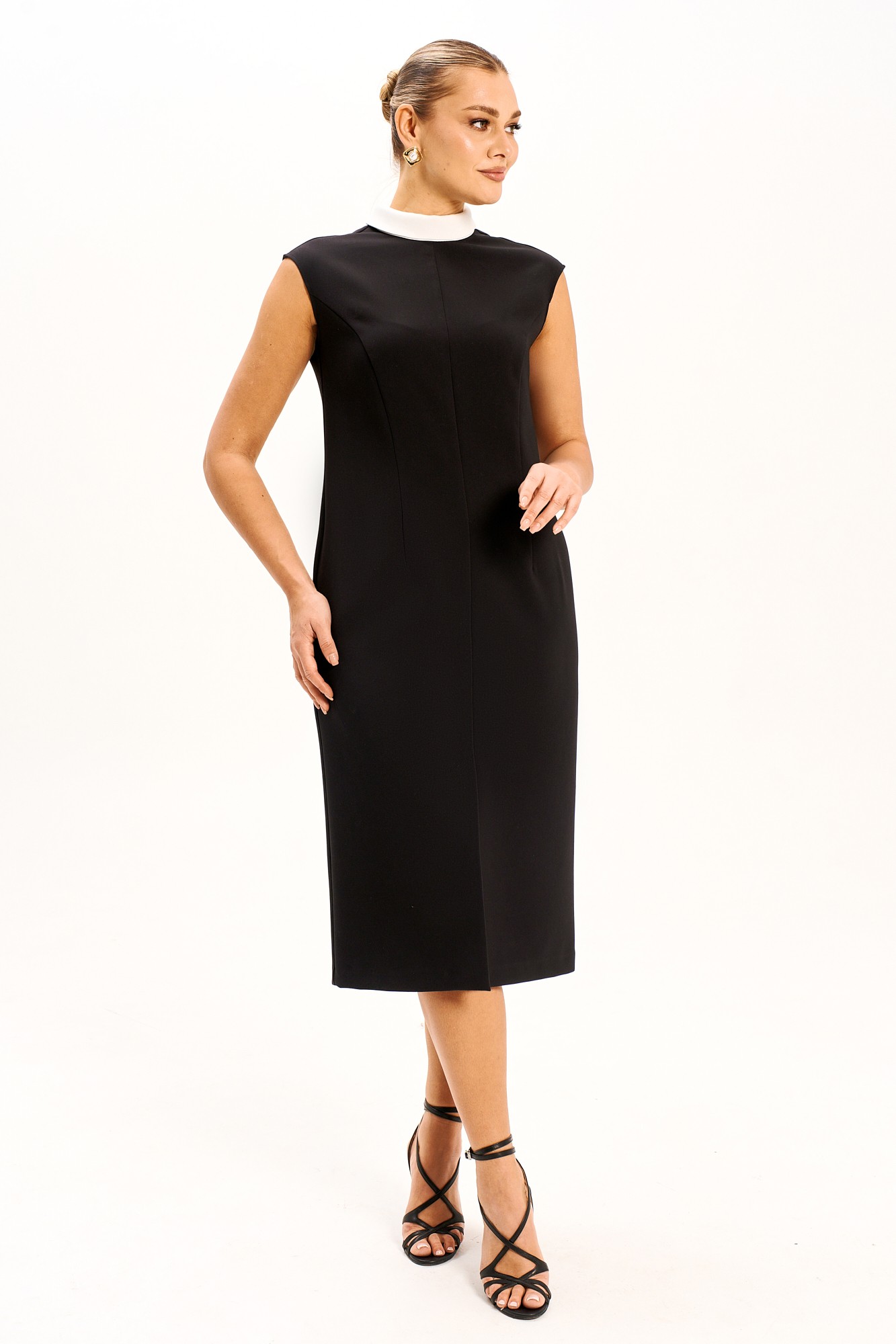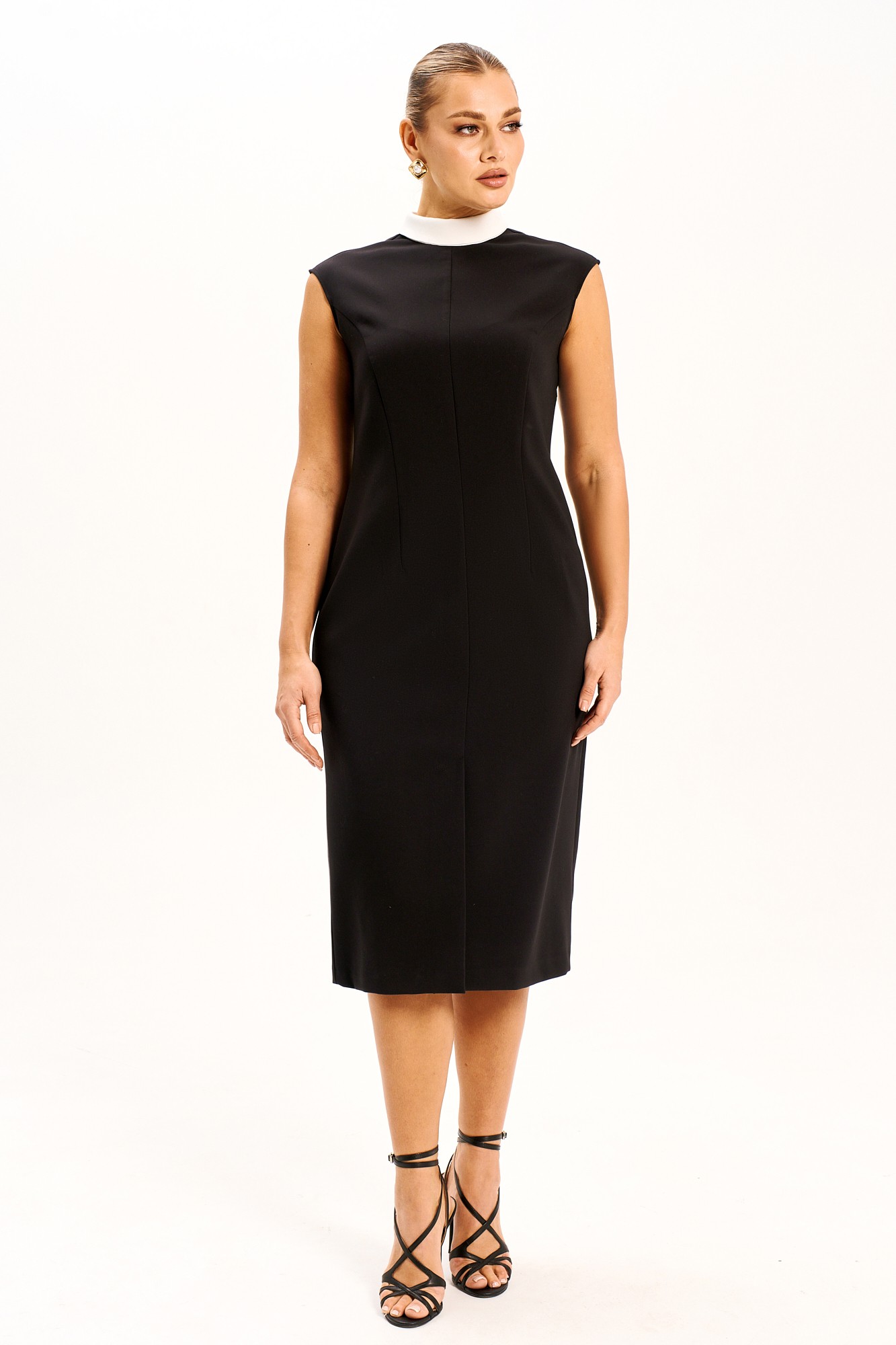 Платье полуприлегающего силуэта, выполнено из плательной ткани средней плотности с рельефами и разрезом по переду. Изделие имеет воротник - стойку контрастного молочного цвета из ткани- компаньона ( платье прошло тестовую стирку при температуре 30 градусов - не линяет). По спинке застежка на потайную молнию, петлю и пуговицу. Платье полностью соответствует заявленному размеру. Пожалуйста, пользуйтесь таблицей замеров готового изделия, чтобы подобрать идеальный размер.