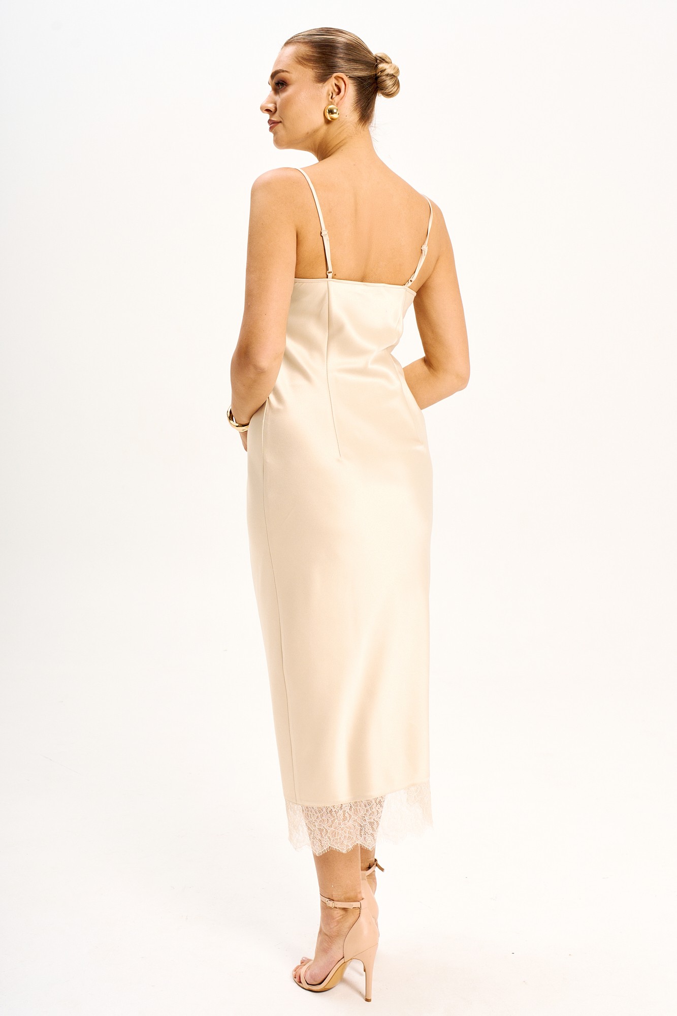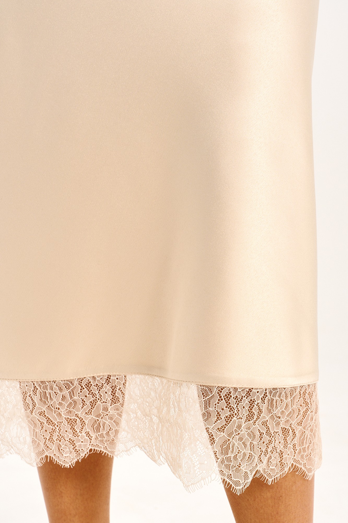 Платье - миди прилегающего силуэта выполнено из струящегося шелк - сатина на регулируемых бретелях и молнией в боковом шве. Подрезы по линии груди и низу платья дополнены мягким французским кружевом, которое держит форму. Платье полностью соответствует заявленному размеру. Пожалуйста, пользуйтесь таблицей замеров готового изделия, чтобы подобрать идеальный размер.