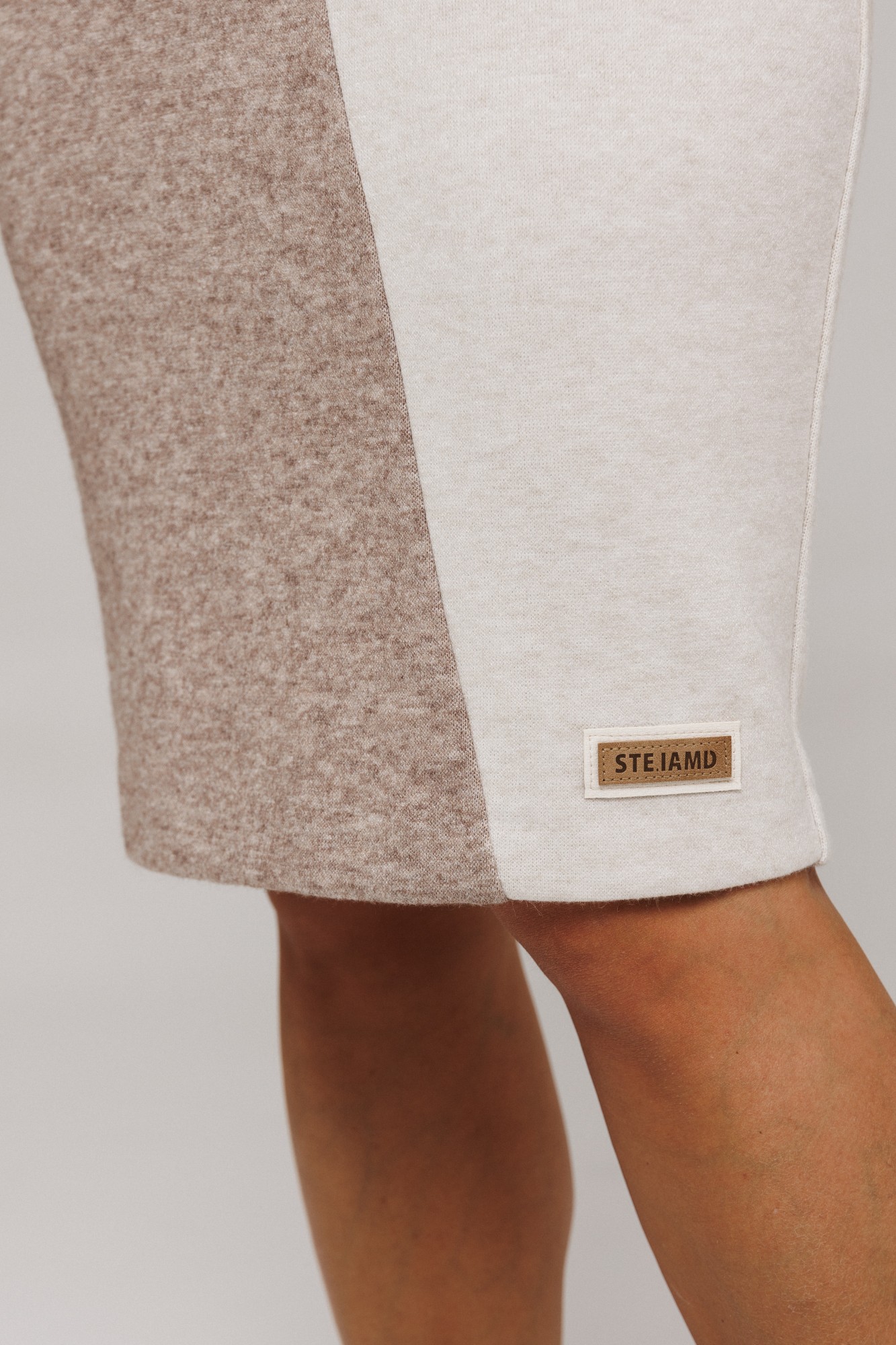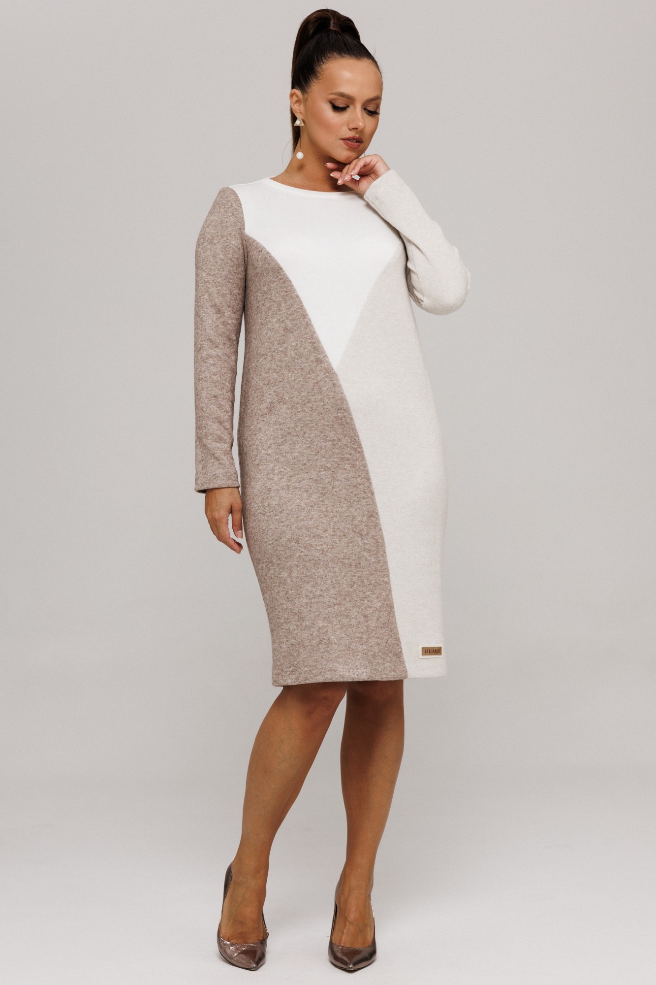Платье женское прямого силуэта, длиной до середины колена. Рукав рубашечного покроя, длинный. Линия плеча немного спущена. Платье выполнено из трикотажного мягкого полотна, с хорошей растяжимостью. Членения спинки и переда ассиметричные. Горловины круглая, обработана узкой бейкой. В нижней части переда слева расположено пришивное украшение— аппликация.