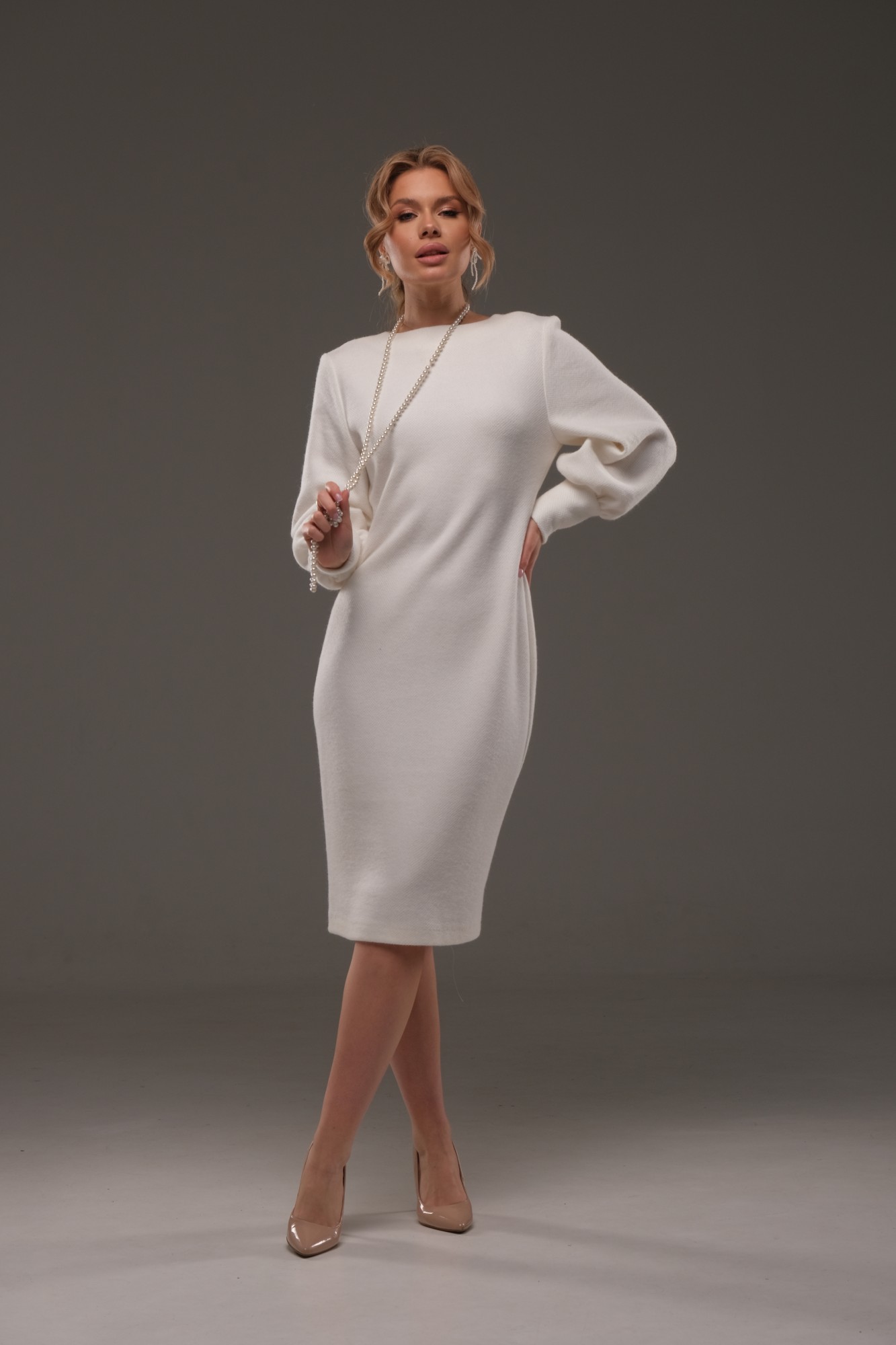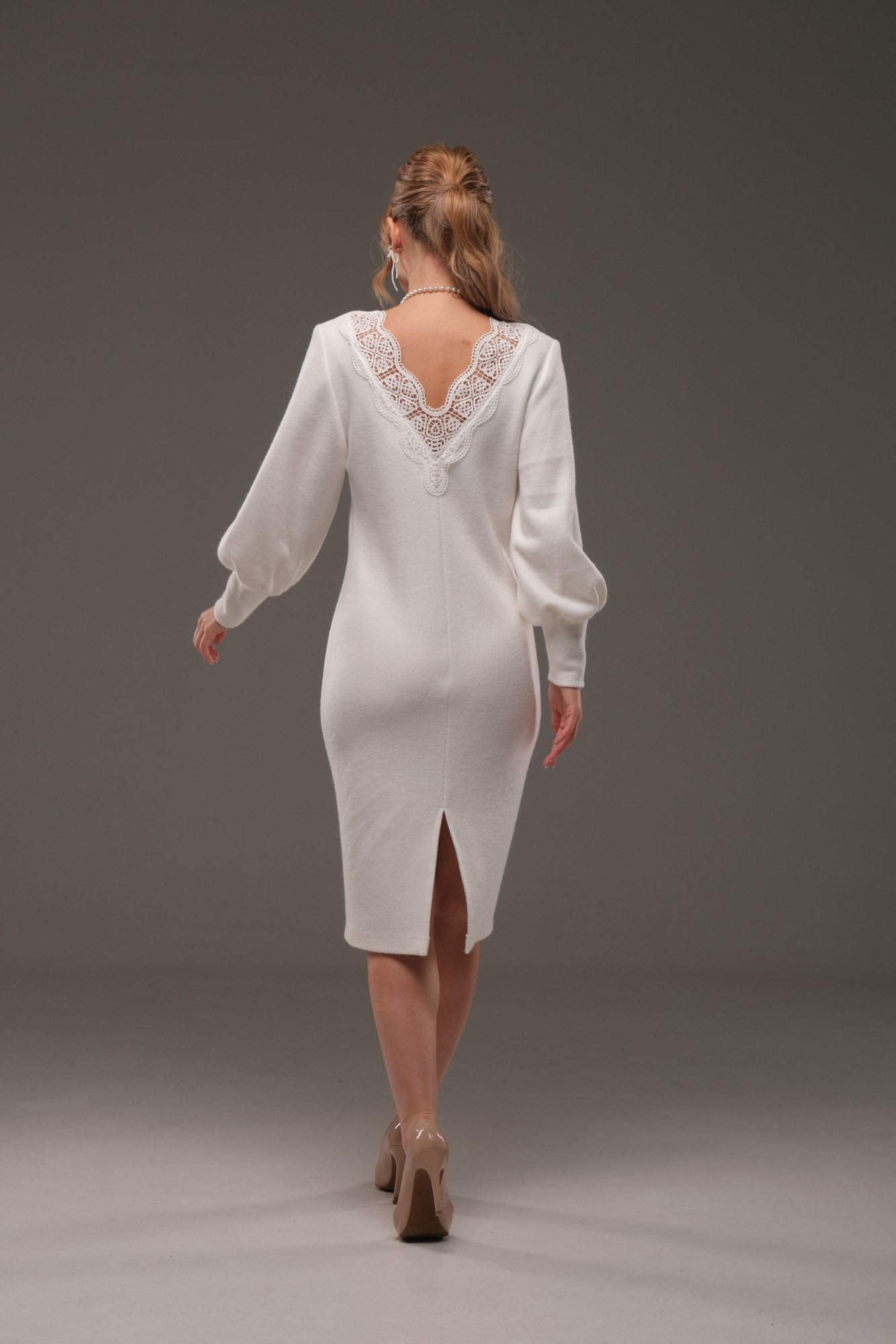 Платье женское прилегающего силуэта из трикотажной ткани. По переду горловина лодочкой. Спинка со средним швом, заканчивающаяся разрезом. На спинке v-образный вырез с притачным кружевом. Рукава одношовные, широкие к низу, собираются на манжету.