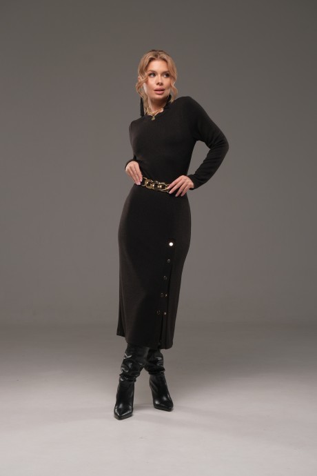 Платье трикотажное, прилегающего силуэта со средним швом по спинке с ремнем .Спереди на левой половинке обработана планка, которая застёгивается на пять кнопок. Рукава гладкие, одношовные. Горловина платья круглая.