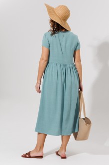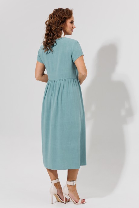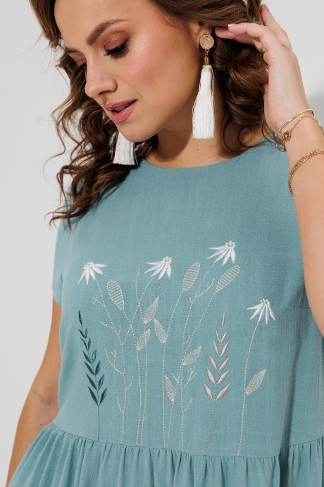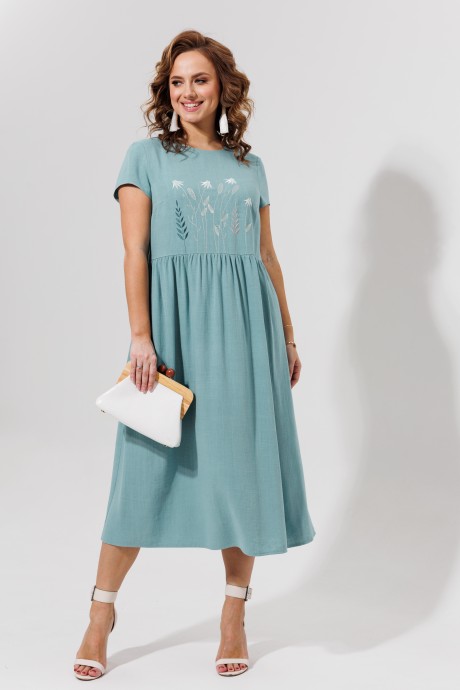 Платье женское отрезное по линии талии, льняное. Перёд с нагрудными вытачками идущими с боковых швов. На верхней части переда расположена декоративная вышивка. Горловина круглой формы. Спинка со средним швом, в которой расположена застёжка горловины на одну пуговицу. Нижняя часть платья собрана на сборку. Рукава одношовные, короткие, гладкие.