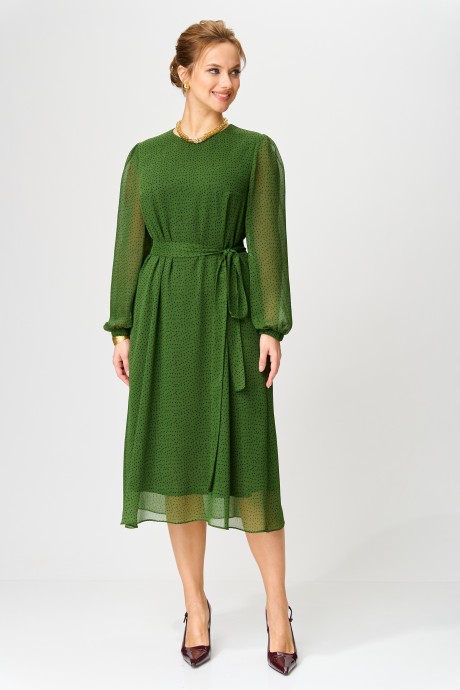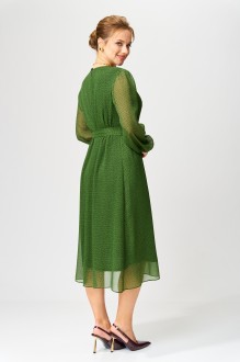 Платье шифоновое А-образного силуэта на подкладке. Перед с двумя нагрудными вытачками. Спинка со средним швом, вверху обработан разрезик с застежкой на петлю и пуговицу. Рукав длинный со сборкой по окату. Низ рукава на резинке шириной 2см. Горловина округлой формы. К платью прилагается пояс из основной ткани.
