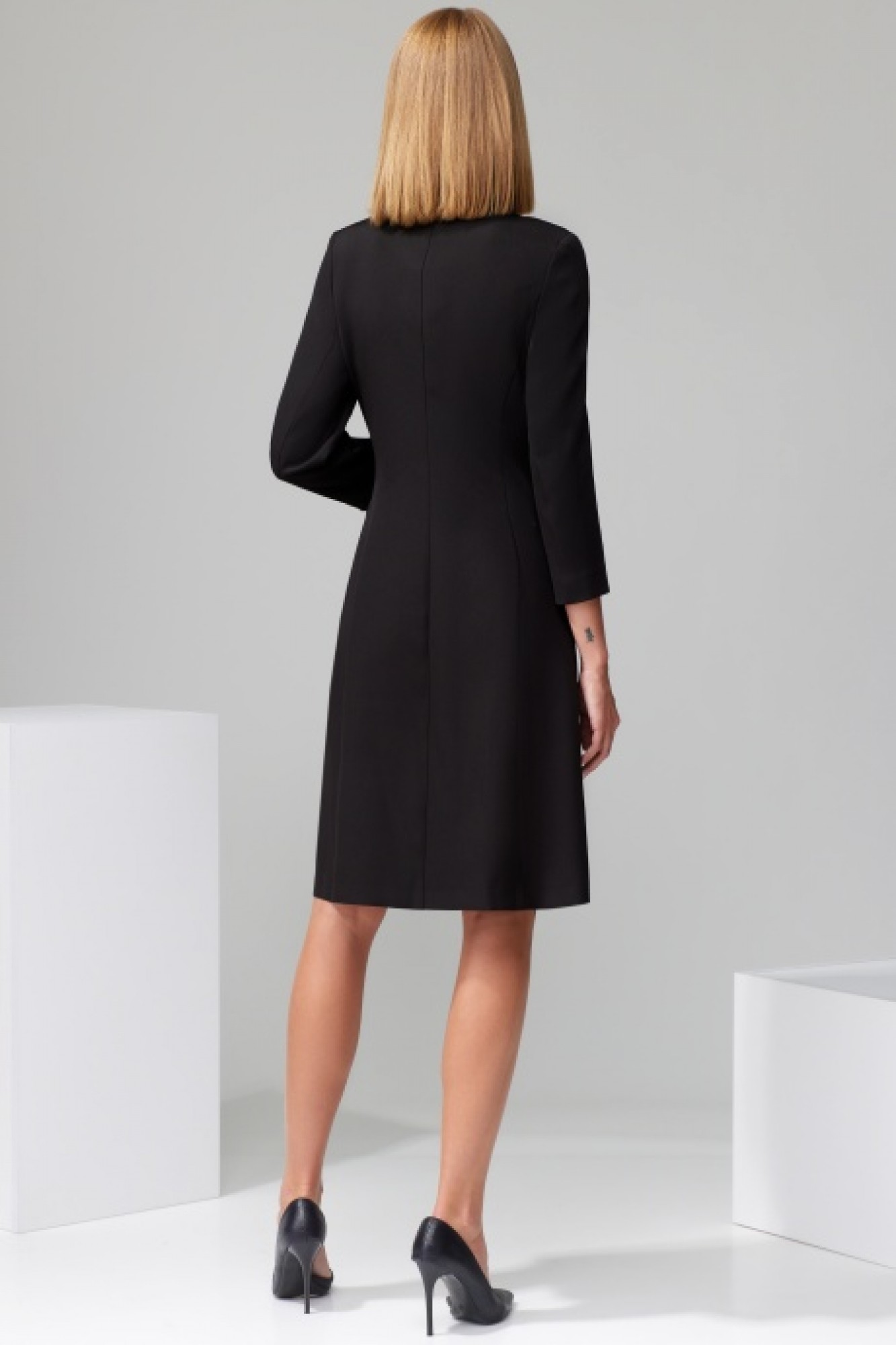 Платье А-образного силуэта на запах с шалевым воротником. Застежка смещенная с хлястиком и полукольцами с борта и поясом из бокового шва, внутри дополнительно фиксируется на потайные пуговицы и петли. Правая часть переда с рельефом. Левая часть переда отрезная по линии талии, в верхней части рельеф. Нижняя часть выполнена из плиссированного шифона с принтом. Спинка со средним швом и рельефами. Рукав втачной двухшовный. Длина платья - 100 см, длина рукава - 49 см.
