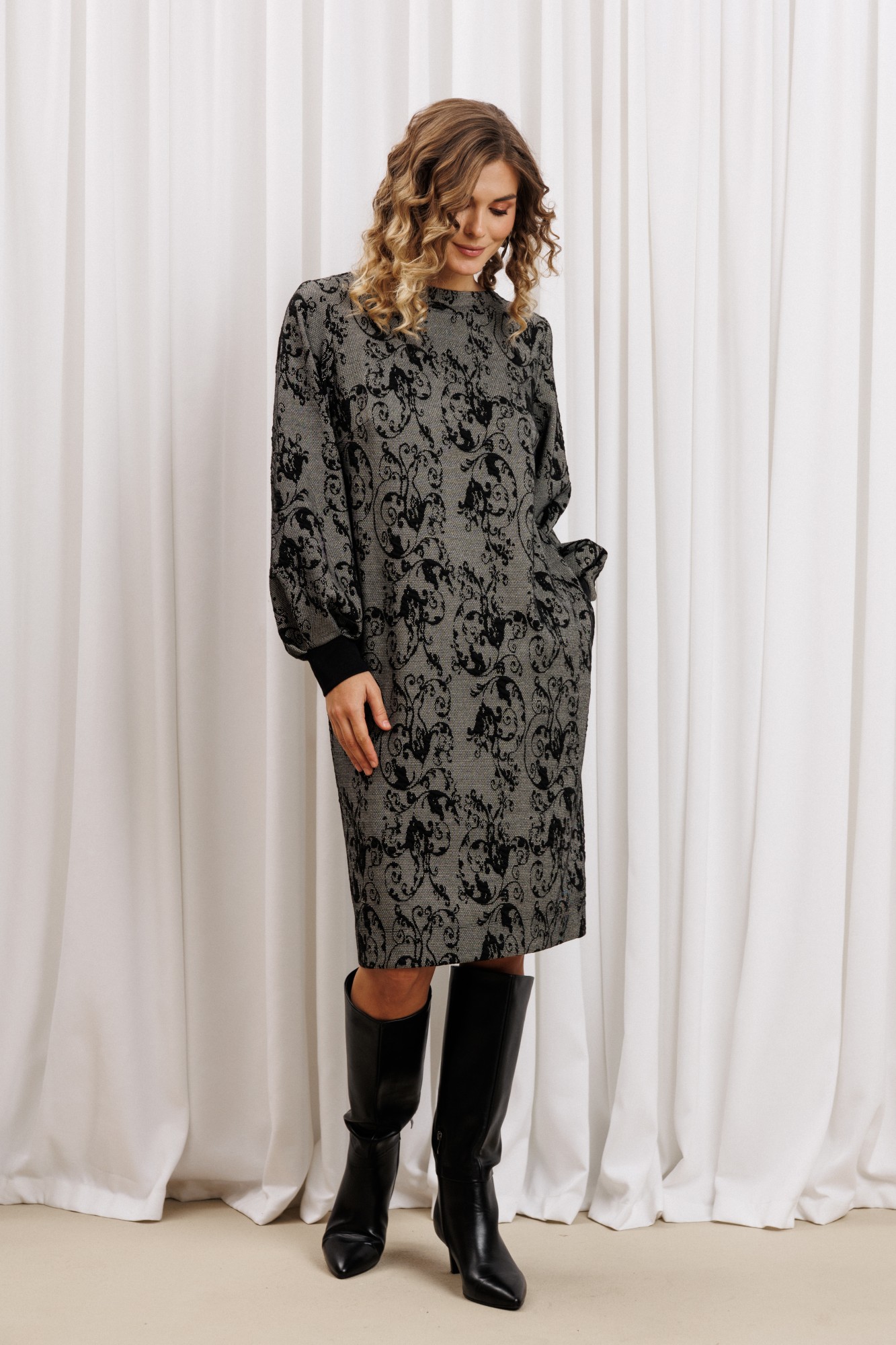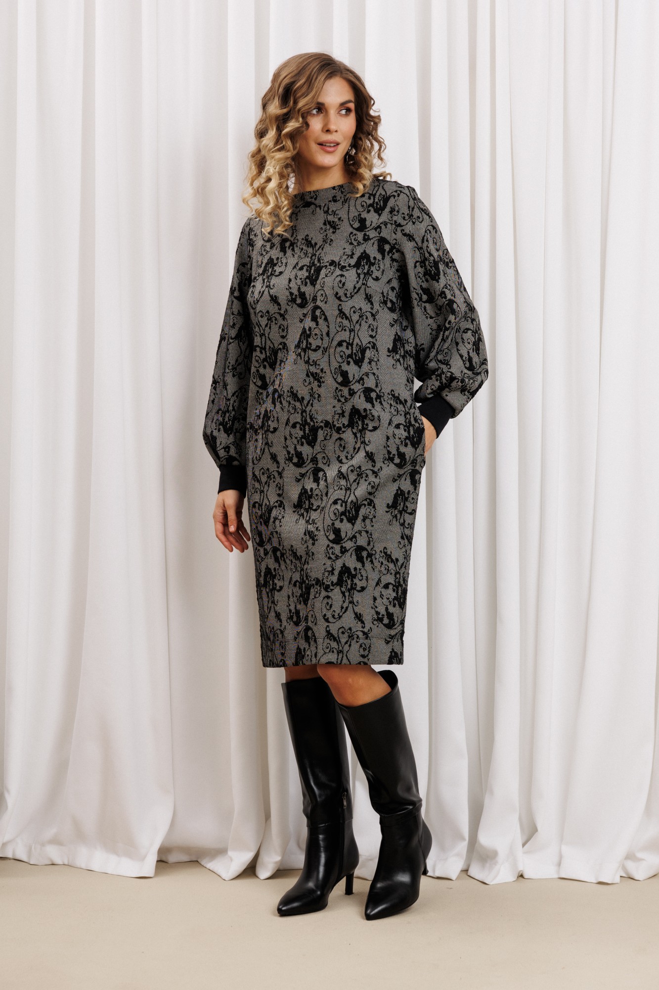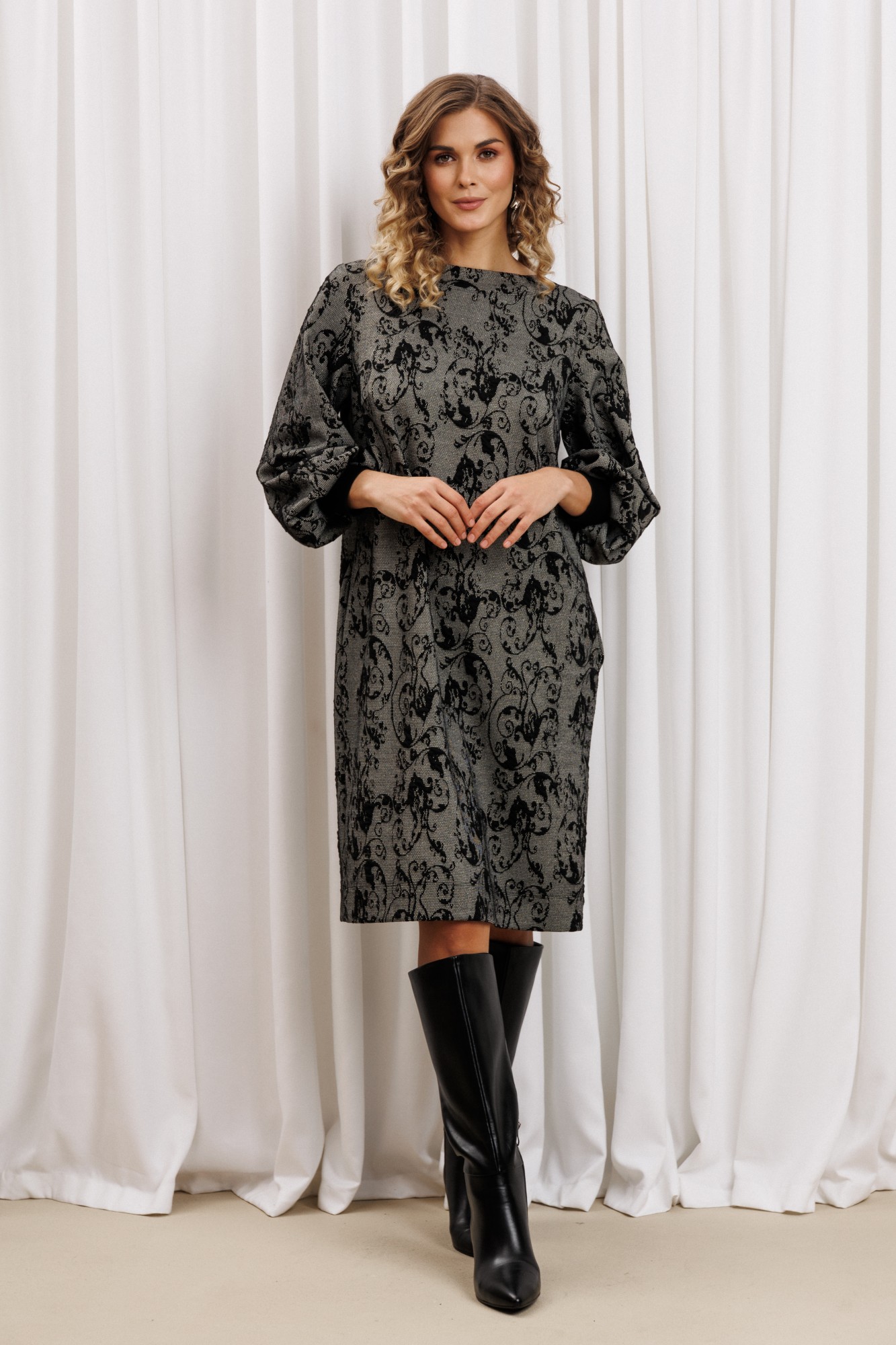 Платье прямого силуэта из плотного трикотажного полотна. Перед с нагрудными вытачками. Спинка со средним швом. Горловина лодочкой обработана планкой. Рукав одношовный втачной по низу со складками собранными на манжету-довяз.