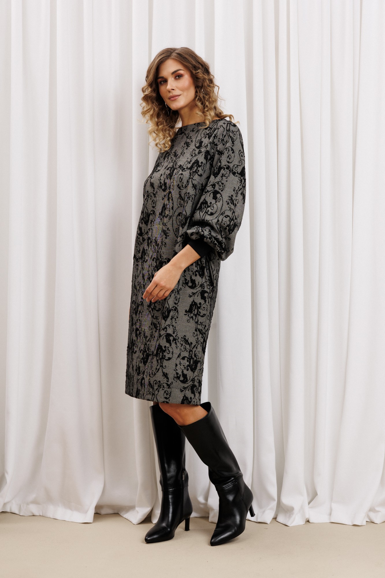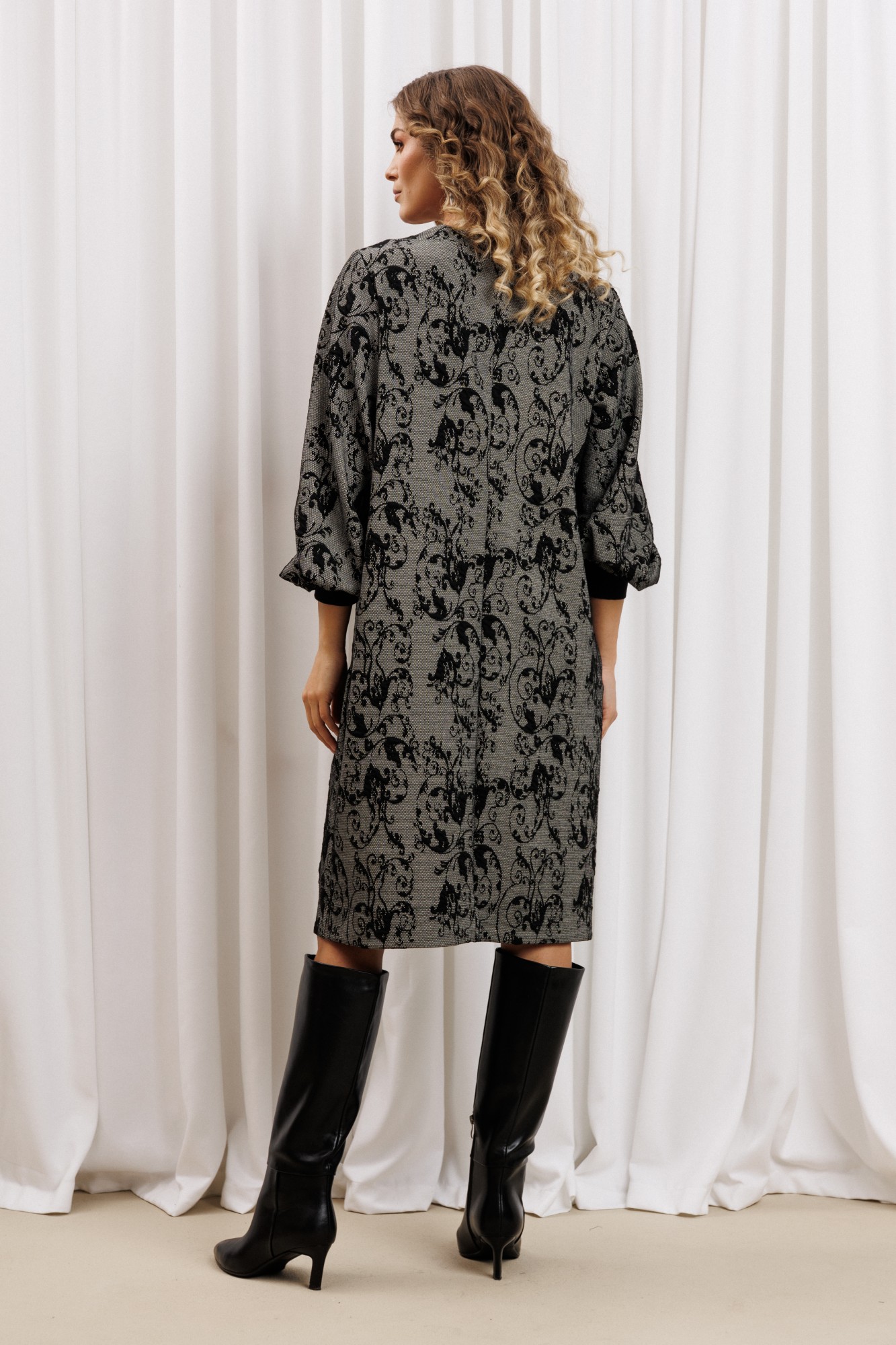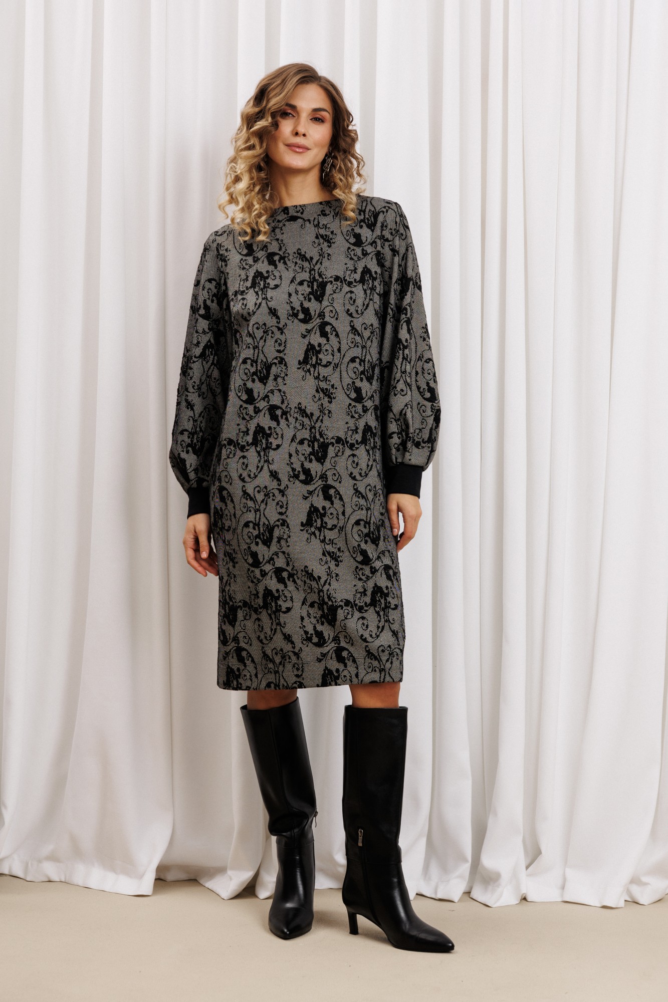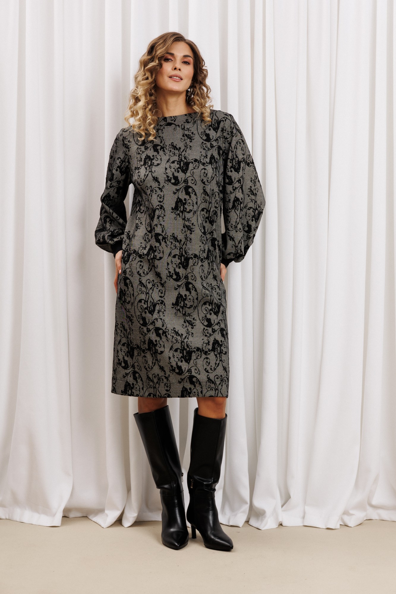 Платье прямого силуэта из плотного трикотажного полотна. Перед с нагрудными вытачками. Спинка со средним швом. Горловина лодочкой обработана планкой. Рукав одношовный втачной по низу со складками собранными на манжету-довяз.