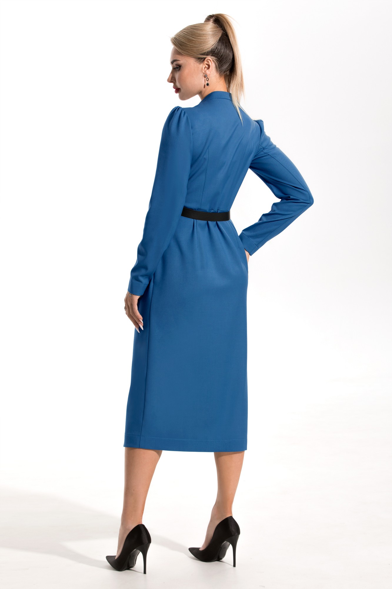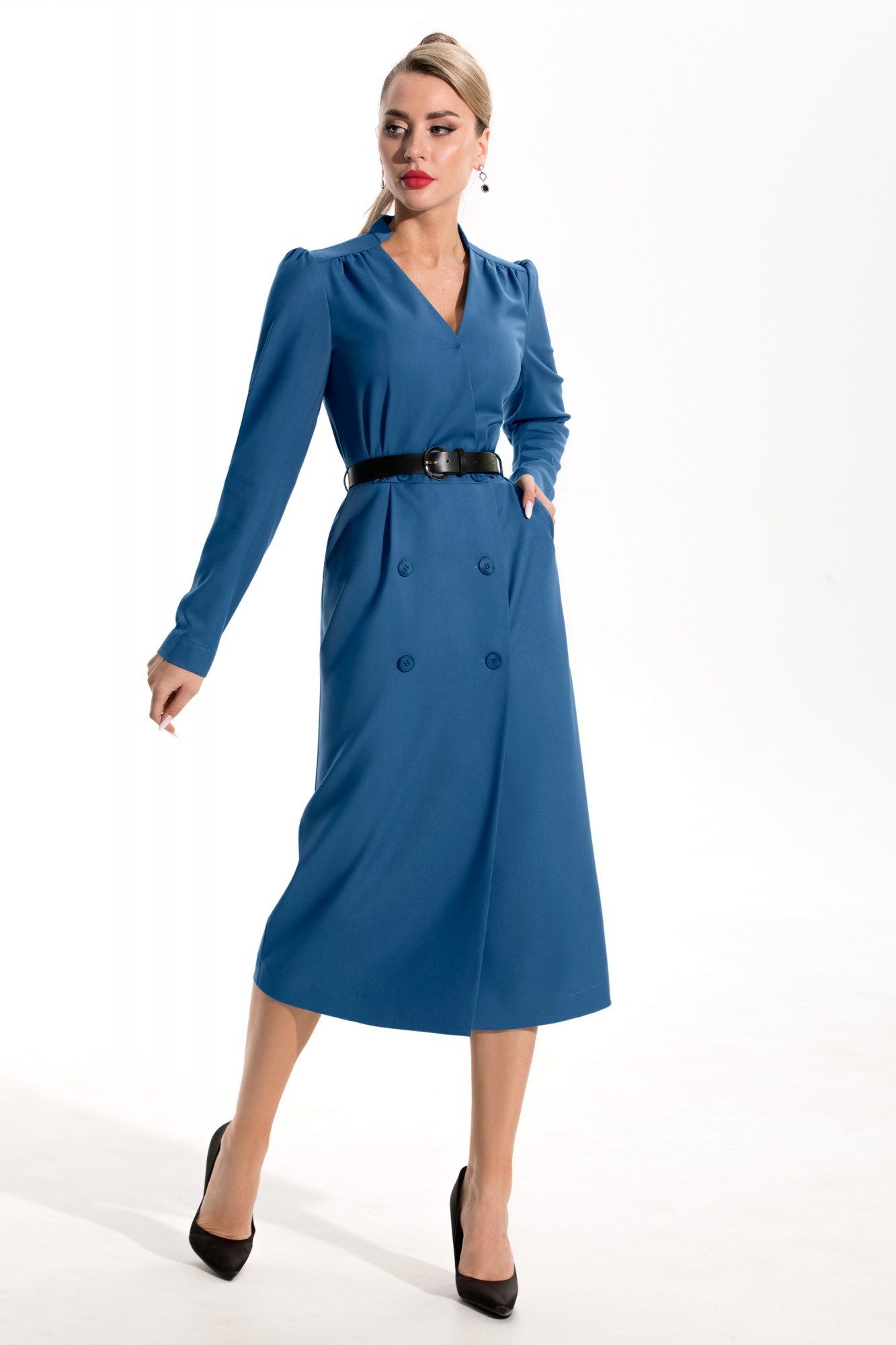 Платье, с центральной двубортной застежкой на петли и пуговицы, отрезной стойкой. Платье отрезное по линии талии, с небольшой сборкой по шву в области полочек. Верхние части полочек с отрезными кокетками. Полочки присборены по шву притачивания кокеток. Верхняя часть спинки с талиевыми вытачками. В боковых швах расположены карманы, вход в карман наклонный к боковому шву. Рукав втачной, длинный. Платье со съемным поясом. Платье без подкладки.