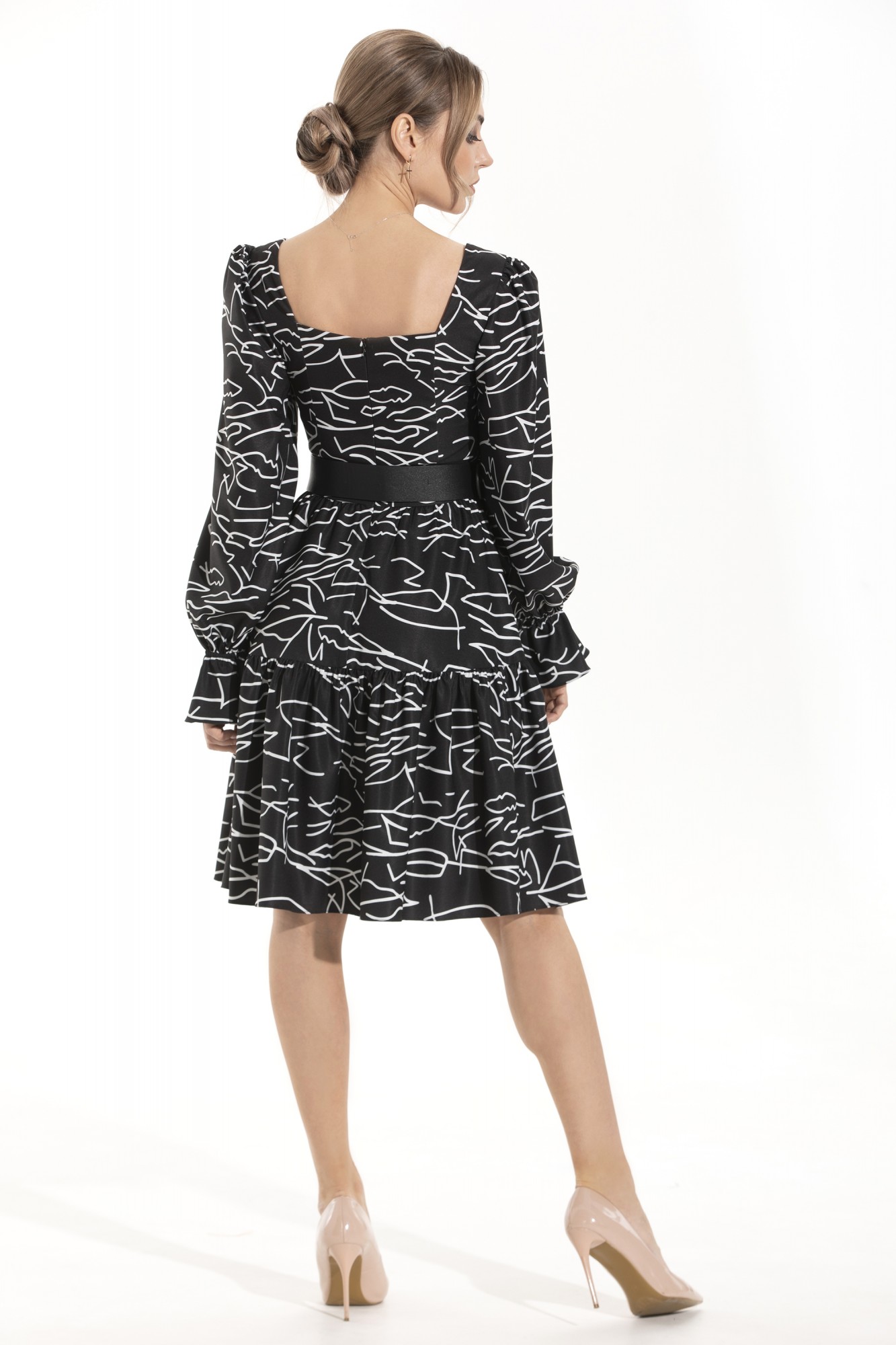Платье, с застежкой на потайную молнию по среднему шву спинки, без воротника, с фигурным вырезом горловины. Платье отрезное по линии талии. Нижняя часть платья состоит из двух воланов. Лиф переда с рельефами, выходящими из горловины. Лиф спинки со средним швом, рельефами, выходящими из горловины. Рукав втачной, длинный, с отрезной манжетой. Окат и шов притачивания манжеты присборен. Платье со съемным поясом.