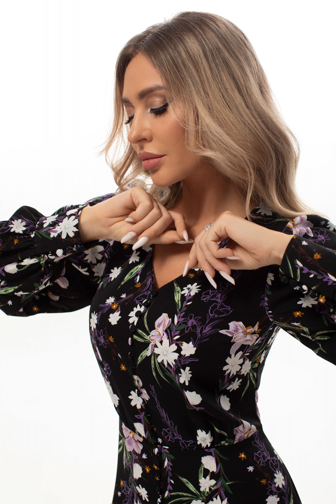 Платье без воротника, с застежкой на потайную молнию в среднем шве спинки, с V-образным вырезом горловины. Платье отрезное по линии талии. Шов по талии частично присборен. Верхняя и нижняя часть переда со средним швом, заканчивающимся разрезом. Спинка со средним швом, талиевыми вытачками. Нижняя часть платья расклешенная. Рукав втачной, длинный, с отрезной манжетой. По окату и шву притачивания манжеты рукав присборен.