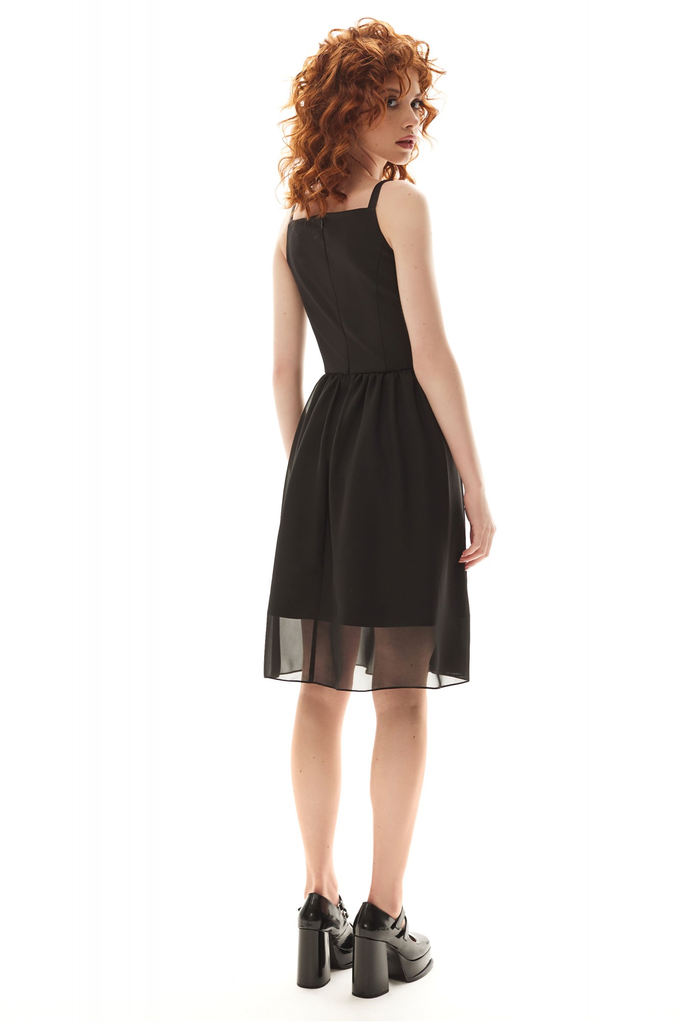 Платье на бретелях, отрезное по линии талии, на подкладке. Лиф прилегающий с рельефами по переду и спинке, с V-образным вырезом декольте. Низ платья представлен широкой юбкой, присборенной по линии талии. Застежка на потайную »молнию». »Молния» расположена в среднем шве спинки. Декольте лифа переда украшено пришивной тесьмой со стразами. Цветовая гамма для верха, подкладки, фурнитуры, отделки: платье из ткани в одной цветовой гамме. Лиф выполнен из плательной однотонной ткани, юбка – из шифона в тон лифу.