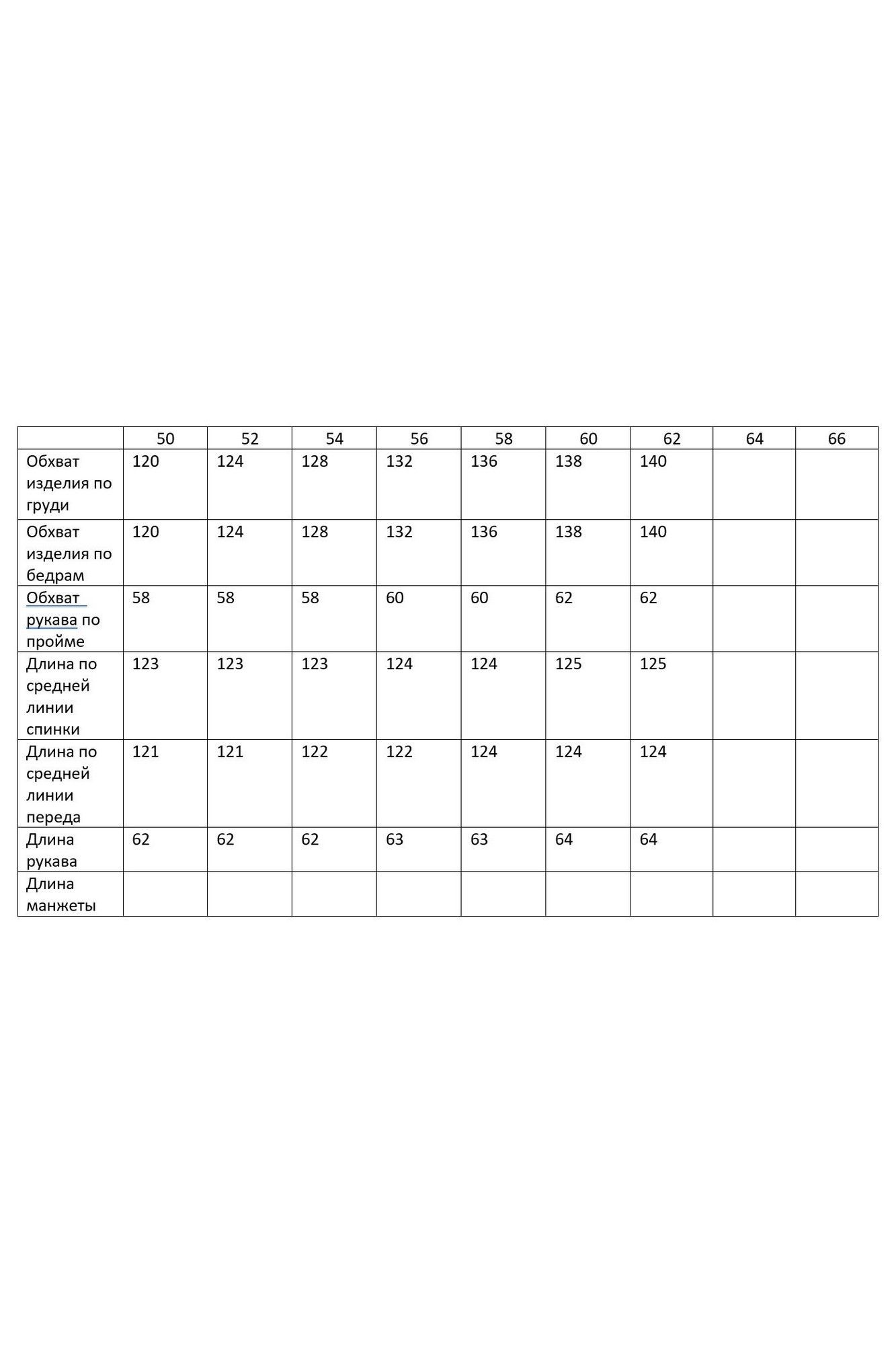 Таблица размеров