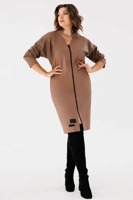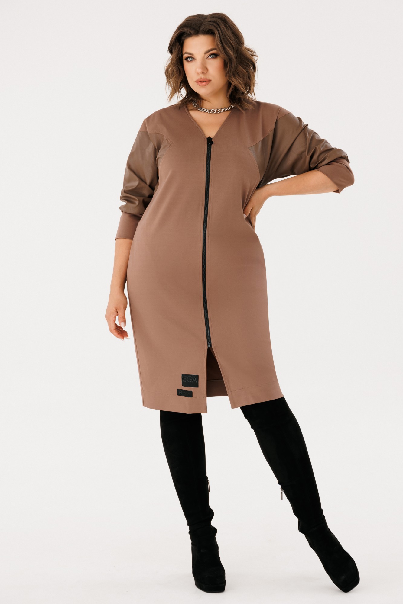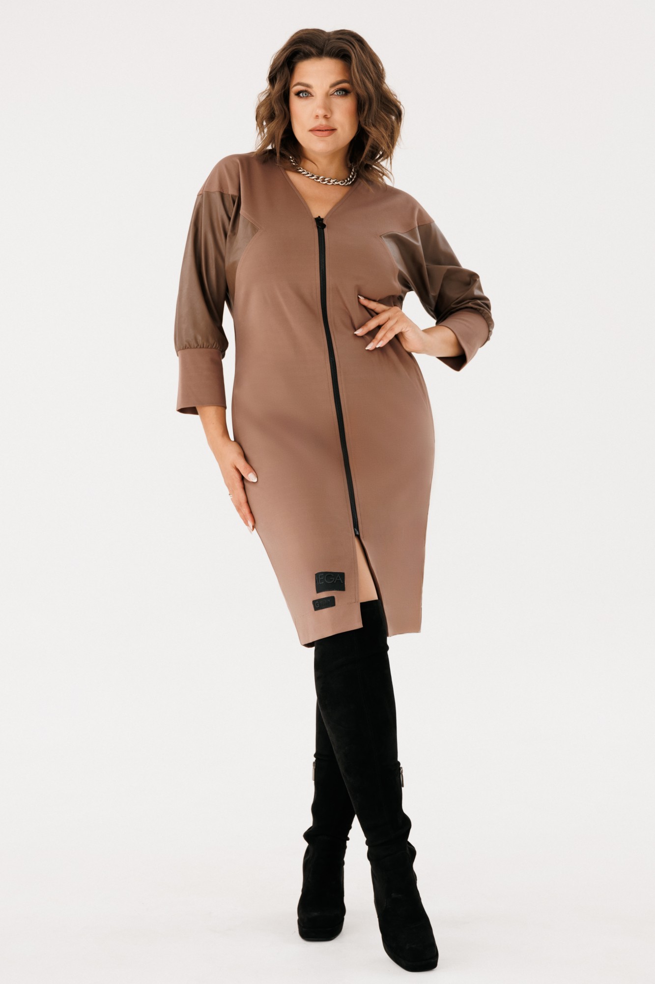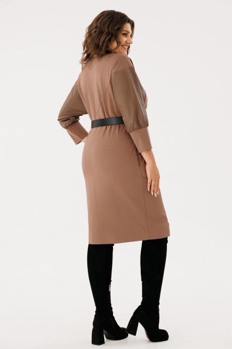 Платье полуприлегающего силуэта, вырез горловины V – образный, рукав цельнокроеный спущенный со вставками из кожи и на манжете внизу. По спинке кокетка, в боковых швах функциональные карманы. Застежка на тесьму-молнию. В комплекте ремень из экокожи.