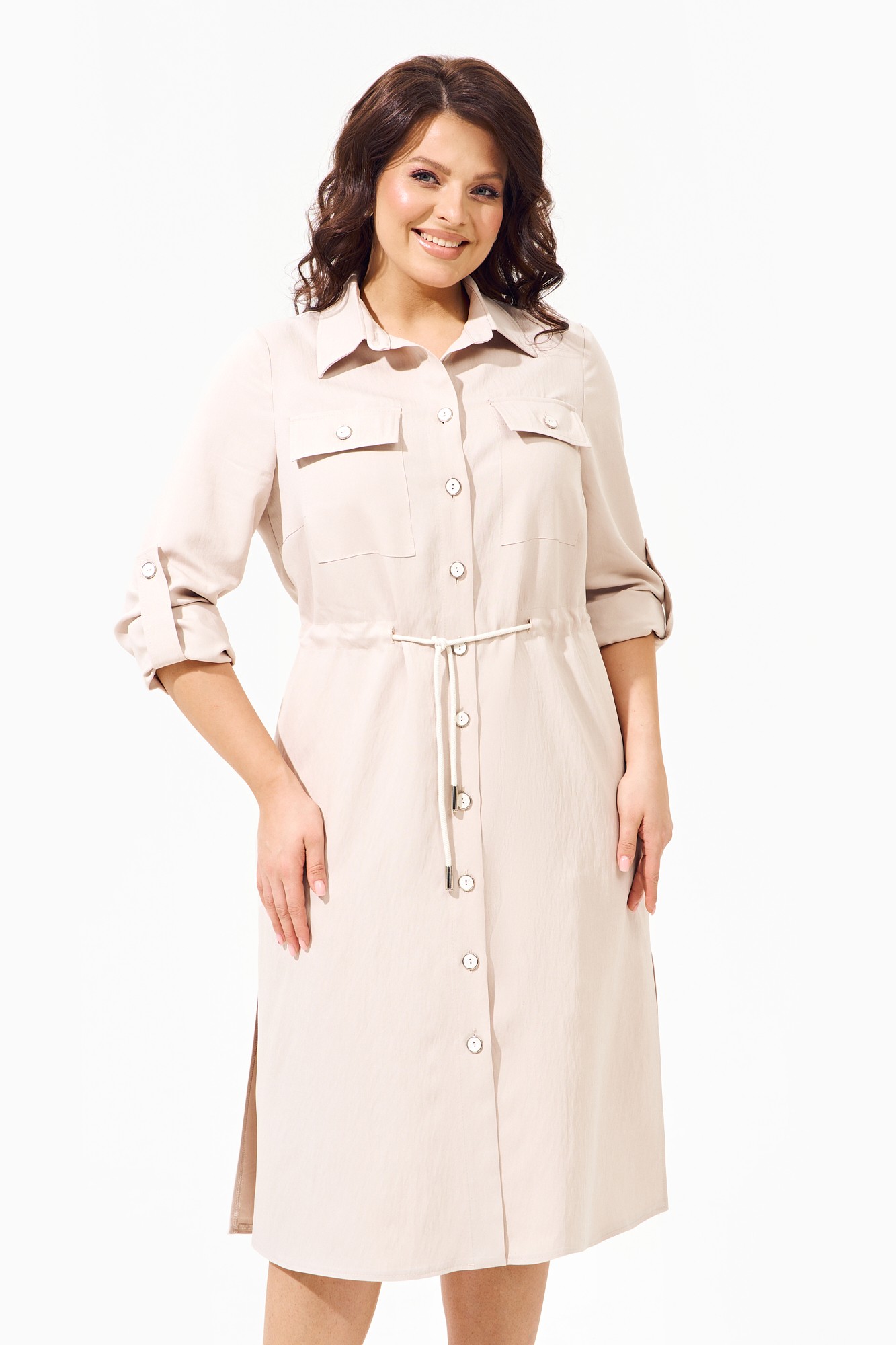 Платье-рубашка полуприлегающего силуэта выполнено из натуральной ткани. Платье свободного силуэта со втачными рукавами, внутренней патой и манжетой, что позволяет регулировать высоту рукава и представляет собой стильную деталь с изысканным акцентом; воротник рубашечный; по переду накладные карманы и функциональная кулиса по линии талии с декоративным шнуром-завязкой; застежка на петли и пуговицы.