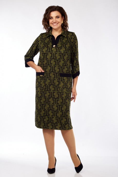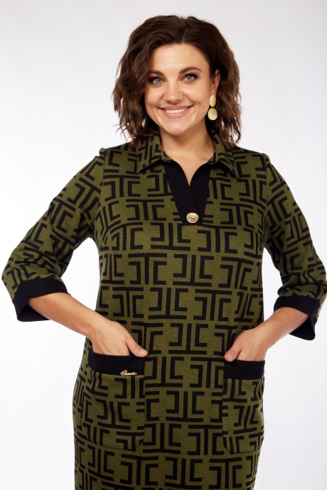 Платье женское прямого силуэта, изготовлено из трикотажного полотна. По горловине воротник рубашечного типа и планки из отделочной ткани с декоративной пуговицей. По переду нагрудные вытачки, накладные карманы с отделочной планкой. И пришитым логотипом. По спинке средний шов с разрезом внизу. Рукава втачные с фигурными манжетами из отделочной ткани.