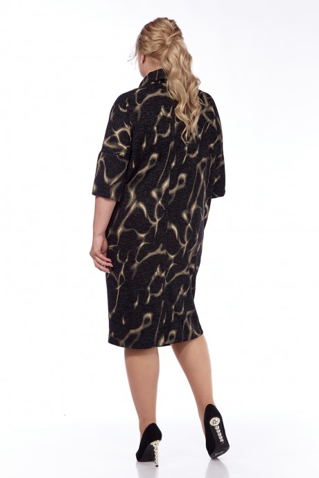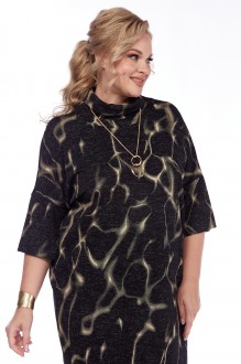 Платье женское, свободного силуэта, изготовлено из трикотажного полотна. Воротник — хомут, перед цельнокроеный спинка со средним швом, в котором обработан разрез. Рукава спущенные. Платье дополнено съемным декором.