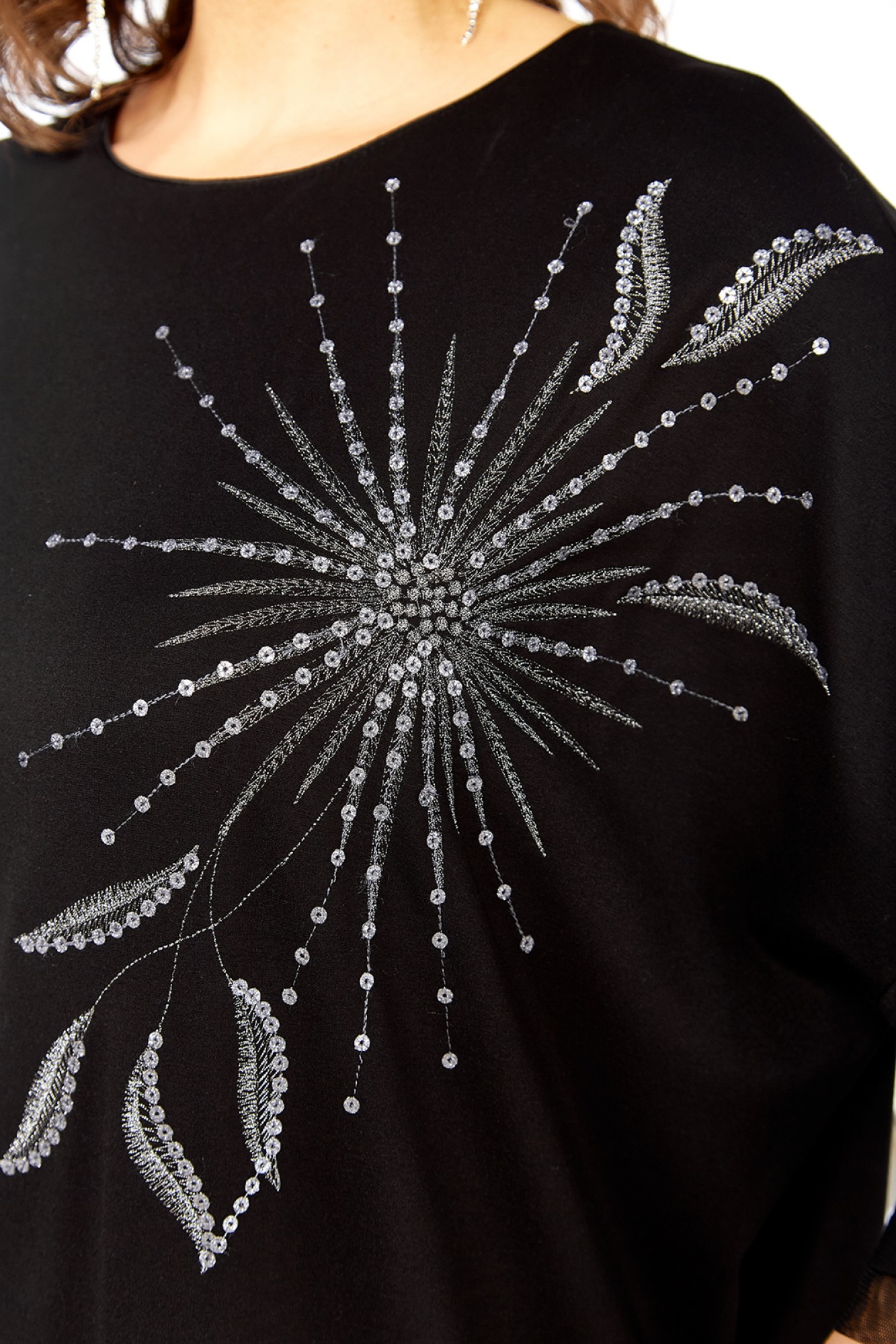 Платье женское, нарядное, изготовлено из трикотажного полотна. Горловина круглой формы, с кантом. На полочке дизайнерская вышивка. Спинка со средним швом и декоративной застежкой вверху. Рукава спущенные, длиной ¾, с сеткой по низу.
