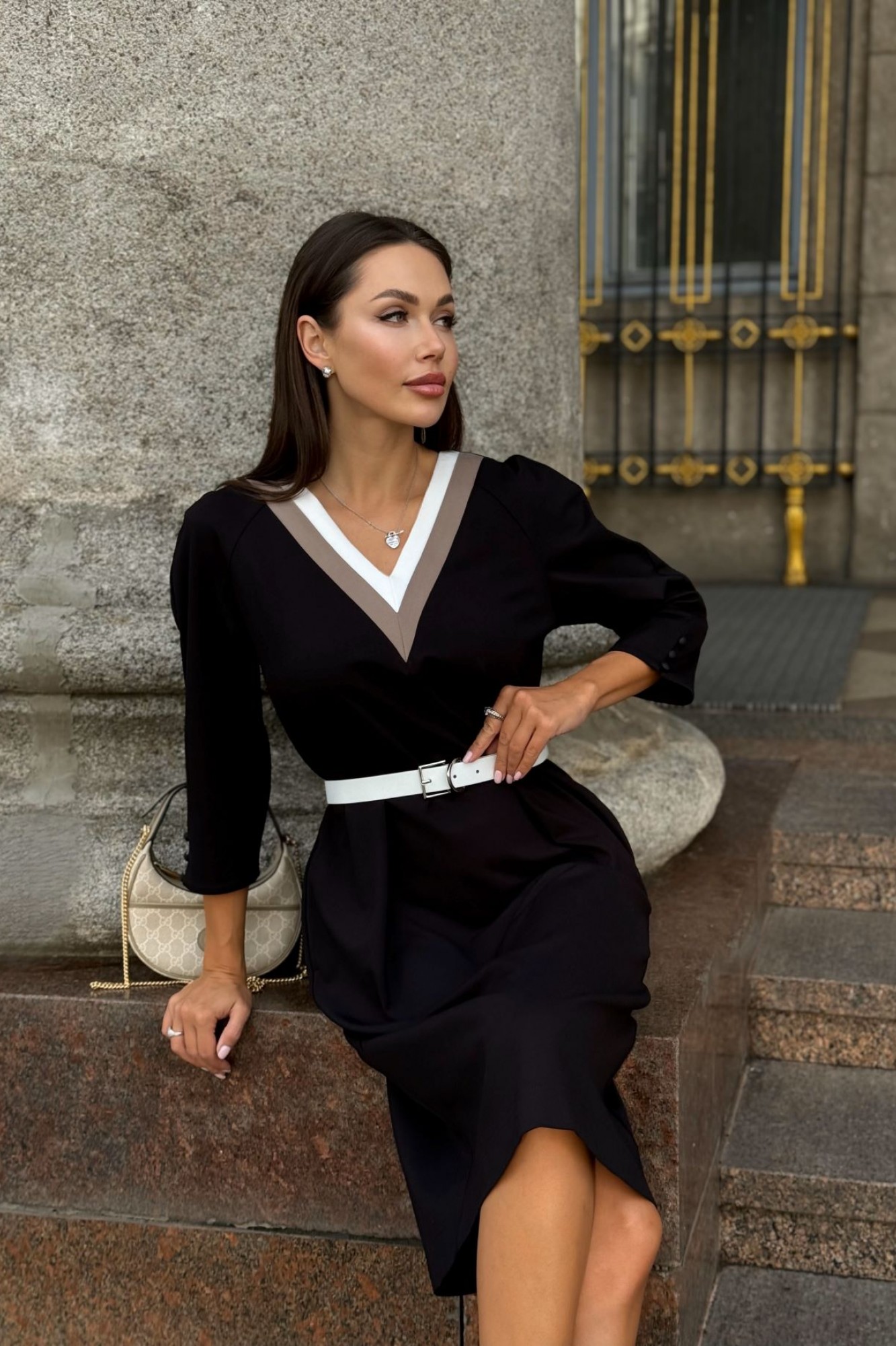 Платье женское, прямого силуэта. Перед цельнокроеный. Спинка со средним швом, в котором обработана по низу шлица. Рукав покроя реглан, двухшовный. В верхнем шве обработана застежка на навесные петли и пуговицы. Горловина V-образной формы, по переду обработана притачными планками контрастного цвета. Ремень входит в комплект. Декоративные элементы и фурнитура могут отличаться от заявленных на фото. Цвет материала может отличаться по тону в зависимости от настроек вашего монитора!
