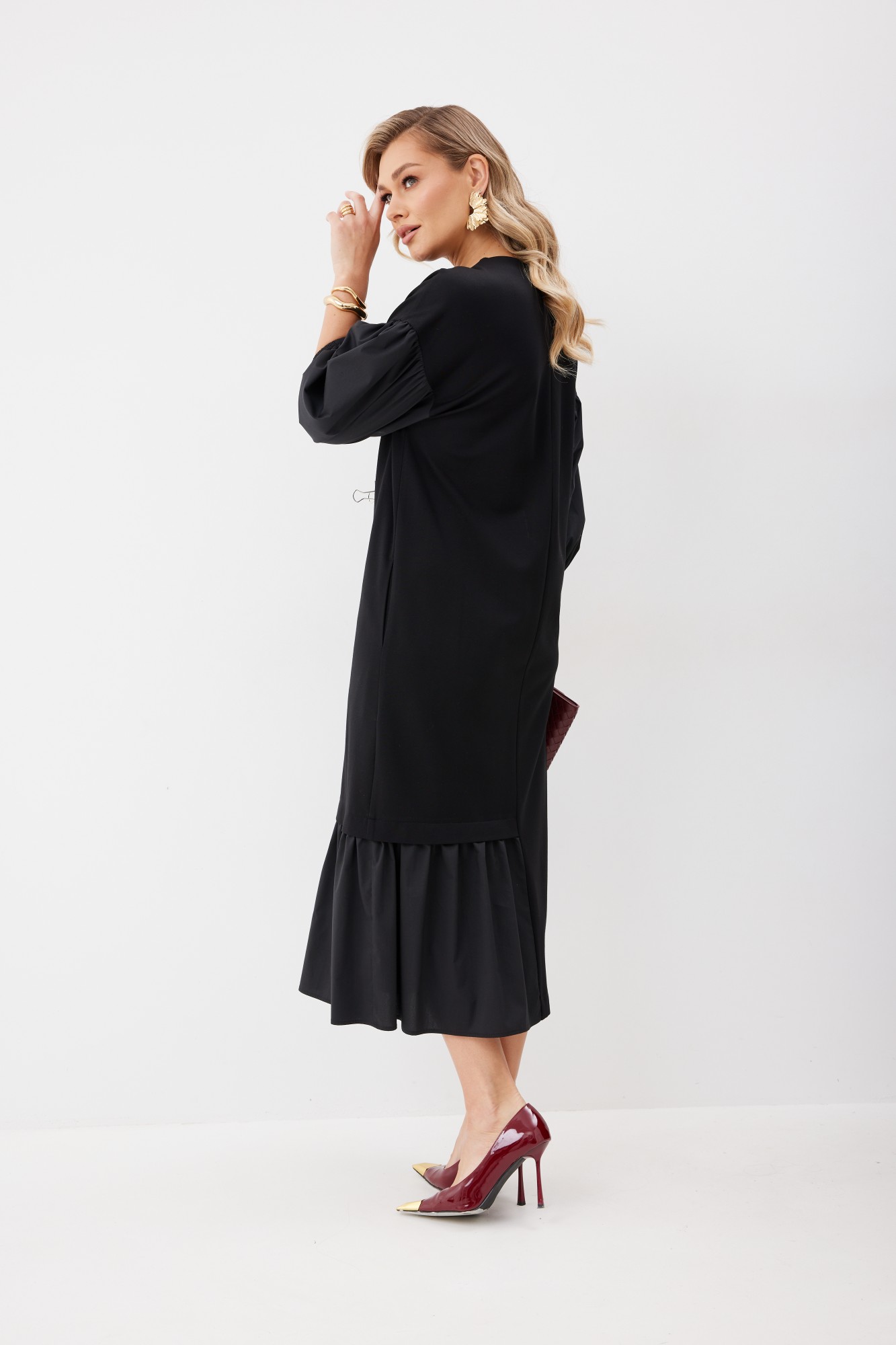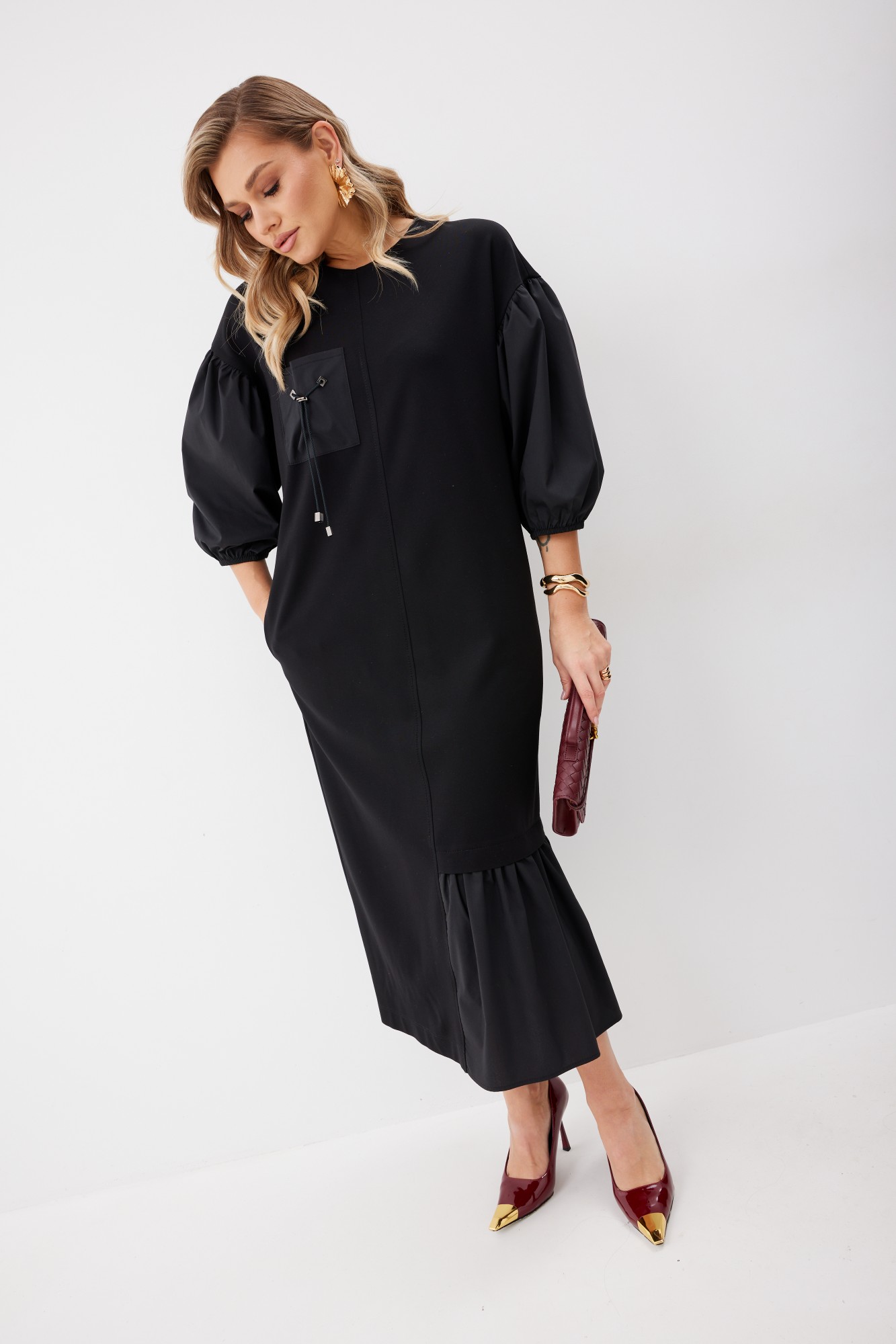 Платье женское прямого силуэта без подкладки из трикотажной ткани длиной до середины икры. Передняя часть платья со средним швом. По левой половинке переда внизу платья пришит волан из ткани – компаньона. По правой половинке переда настрочен нагрудный карман из ткани – компаньона с декоративными элементами. В боковых швах платья функциональные карманы. Спинка платья со средним швом, в котором расположена застежка – «молния». По низу левой половинки спинки пришит волан из ткани – компаньона. Горловина имеет округлую форму. Линия плеча спущена. Рукав выполнен из ткани – компаньона со сборкой вверху рукава и резинкой по низу рукава.