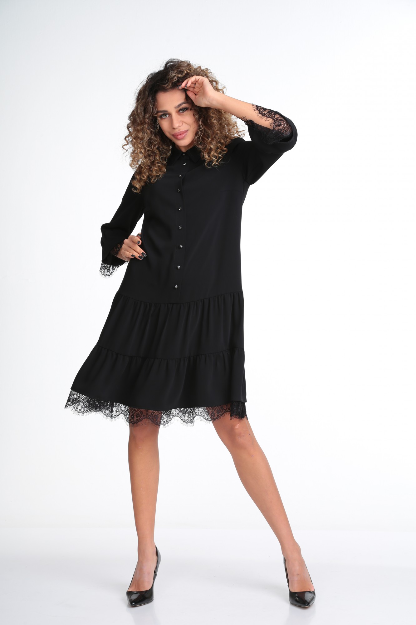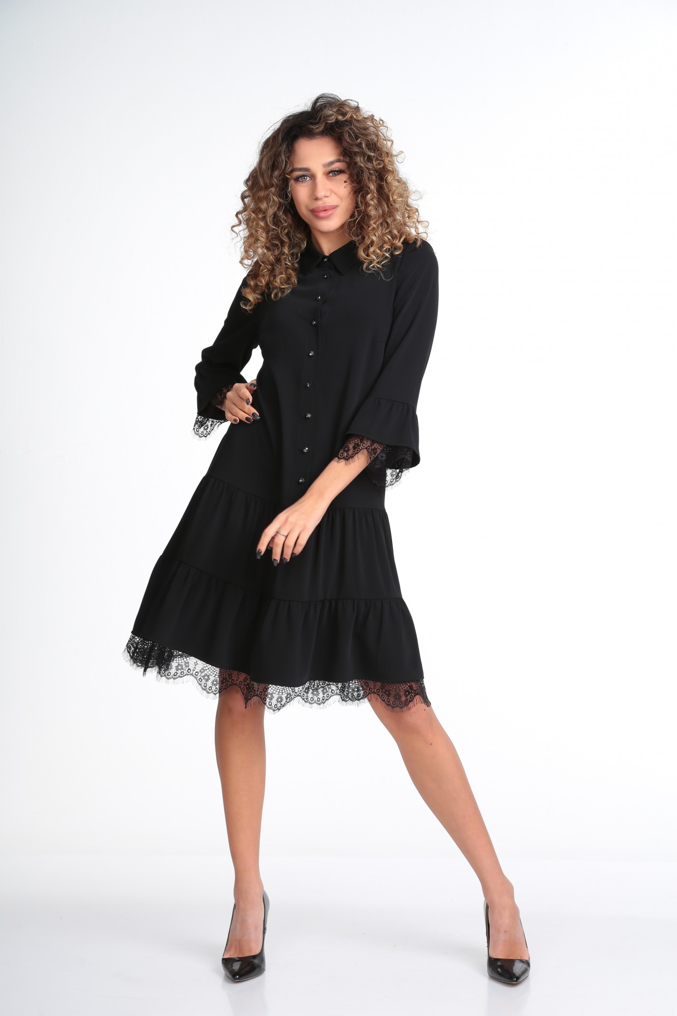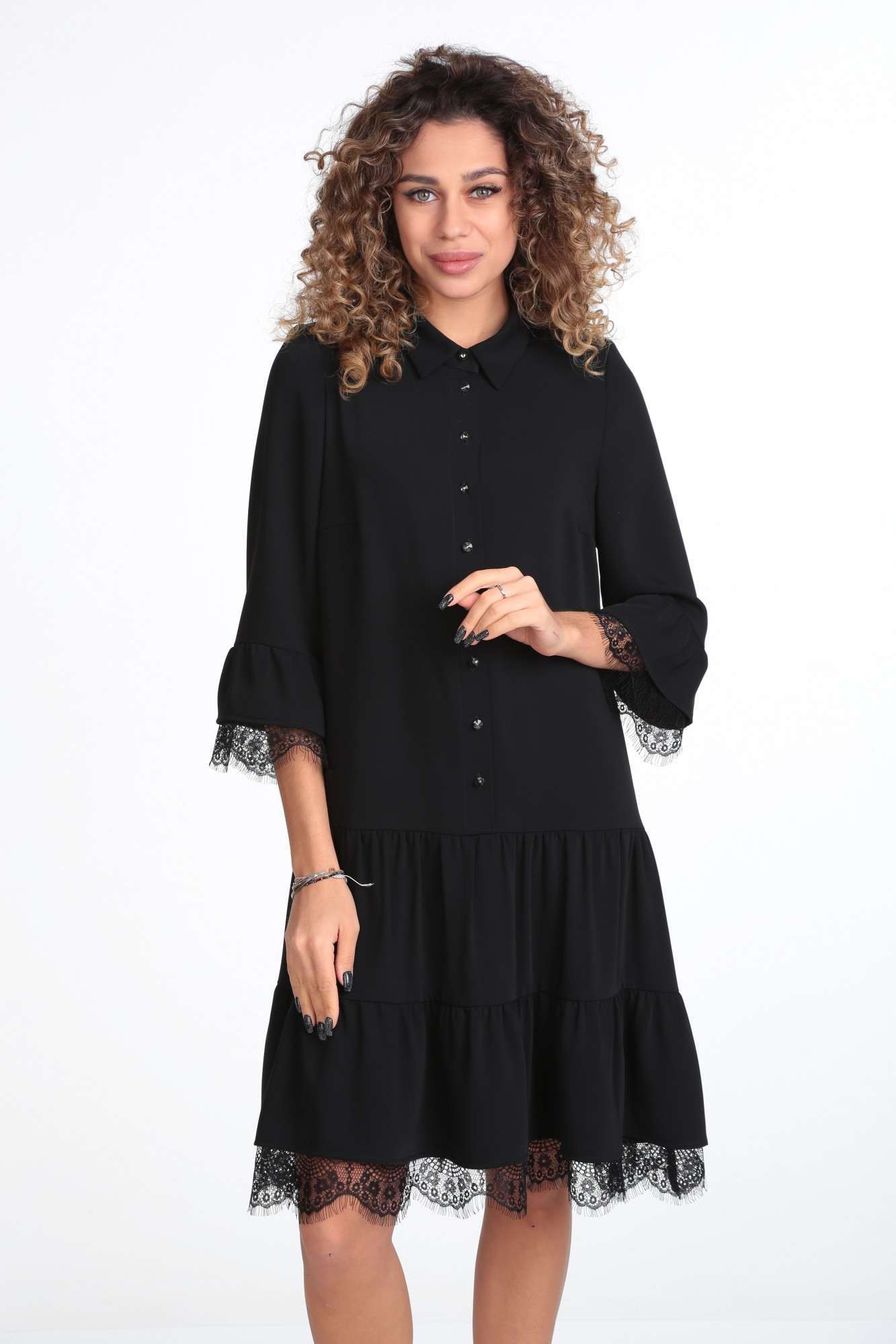 Платье женское полуприлегающего силуэта из плательной ткани , по переду лифа обработана планка на пуговицах , нагрудные вытачки. Юбка платья состоит из двух воланов со сборкой . Рукава втачные, собранные на манжету .Воротник рубашечного типа .
