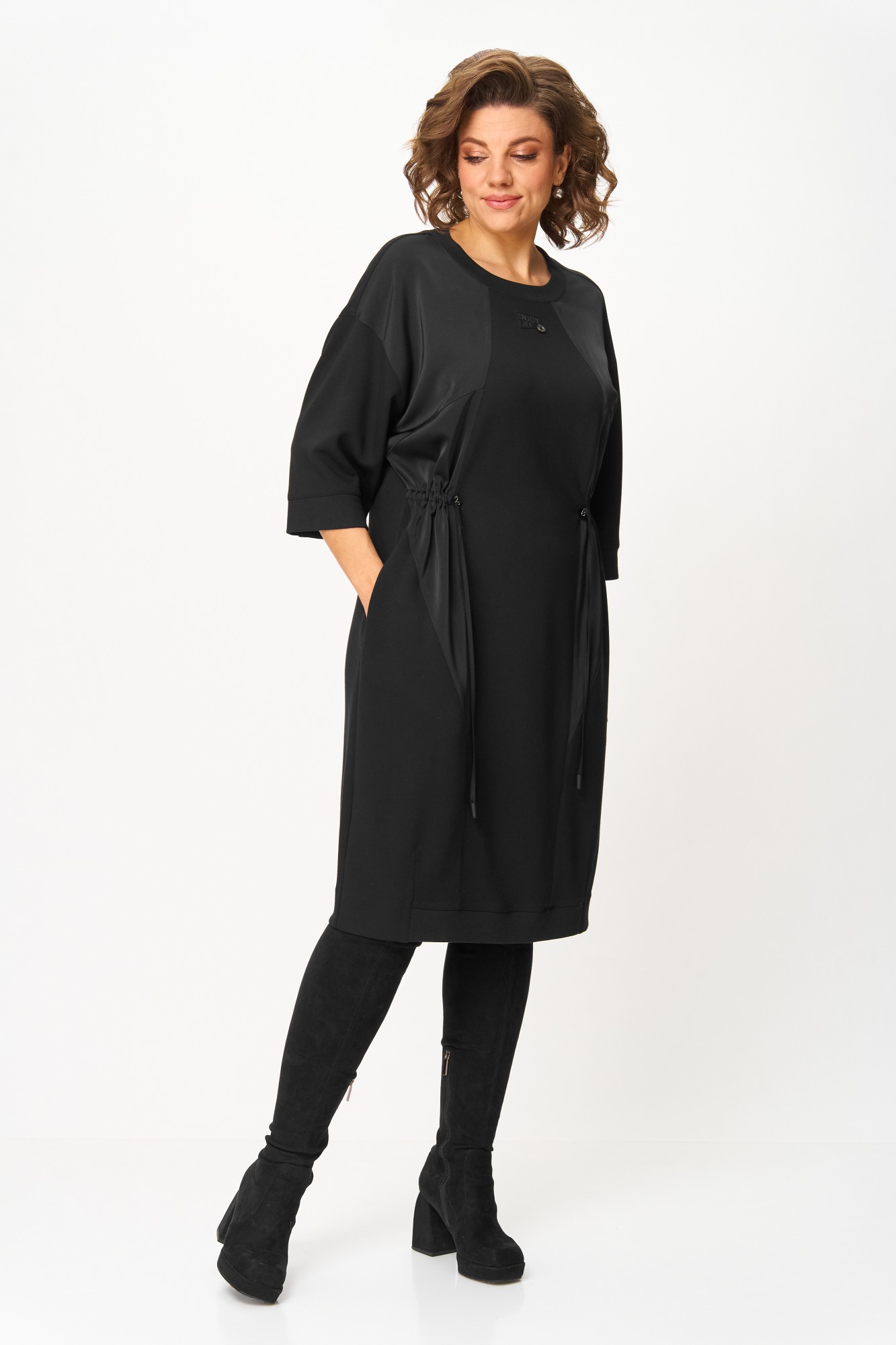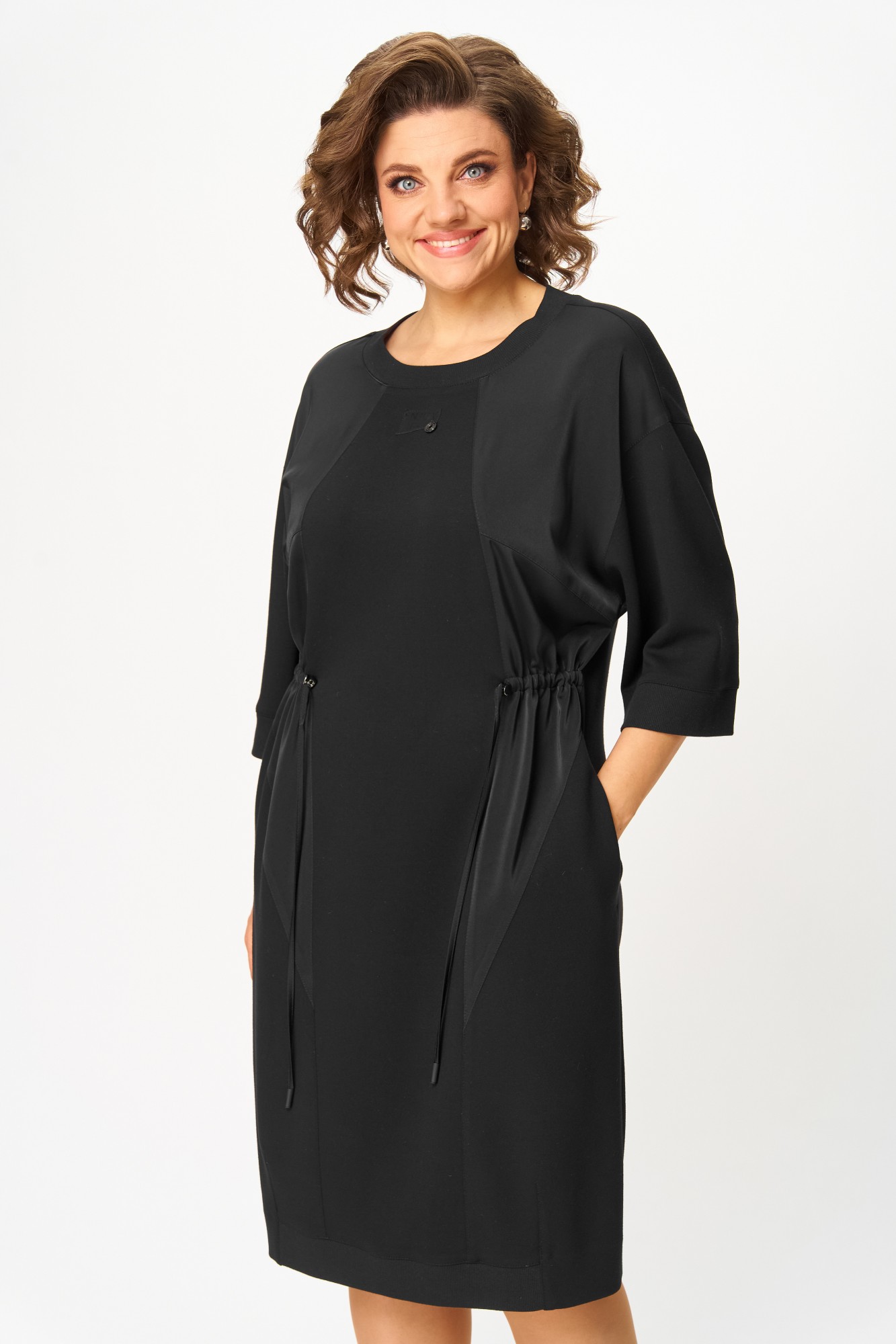Платье женское, выполнено из трикотажного полотна с декоративными вставками из сатина в цвет основного полотна. Силуэт прямой, приталенный за счёт кулисы по передней части платья.