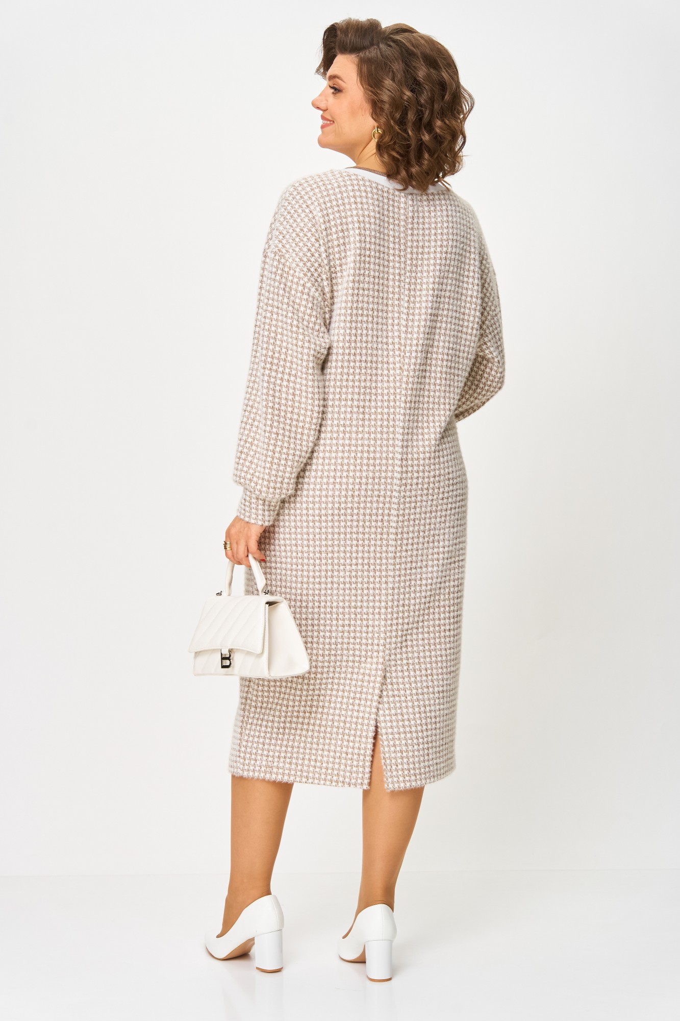 Платье женское. Выполнено из мягкого теплого трикотажного полотна средней плотности с небольшим ворсом. Не колется!!! Платье имитирует джемпер с юбкой. Перед платья частично ( верхняя часть) на подкладке. Силуэт платья: лиф свободный в верху и юбка заужена к низу. Горловина овальная обработана довязом. Имитация кармана на части переда. По нижней части переда пришит декор из довяза. Покрой платья свободный, линия плеча спущена. Рукав длинный, низ рукава на манжете. Спинка прямая со средним швом, внизу шлица для хода. Платье без застёжки.