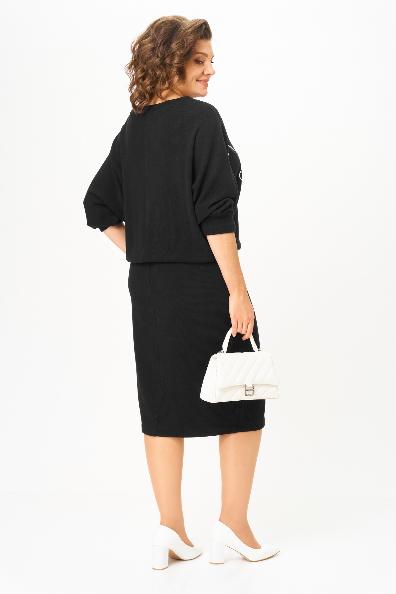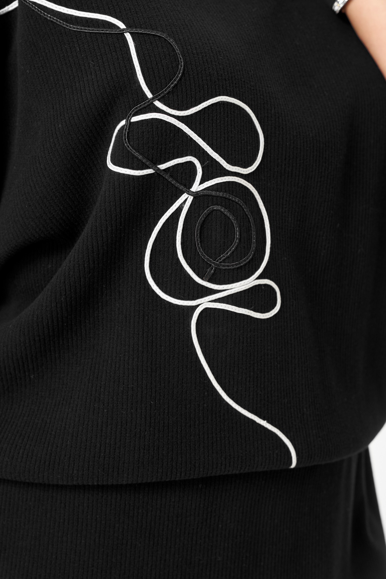 Горловина овальная, обработана бейкой, хорошо растягивается. Покрой изделия цельнокроеный. Силуэт лифа платья свободный. К низу платье прямое, слегка заужено. По линии талии вставлена резиночка. На детали переда выполнена декоративная вышивка тонким шёлковым шнуром. Спинка платья без особенностей. Платье без застёжки, без подкладки.