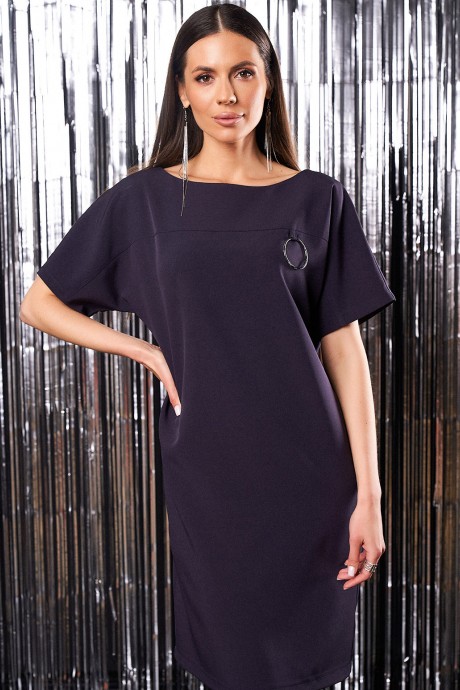 Платье женское свободного кроя, прямого силуэта с цельнокроеным рукавом. Горловина – лодочка. На левой стороне переда декоративное металлическое кольцо. Спинка с фигурным вырезом, украшена металлическими кольцами.