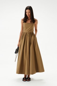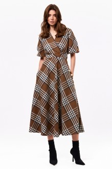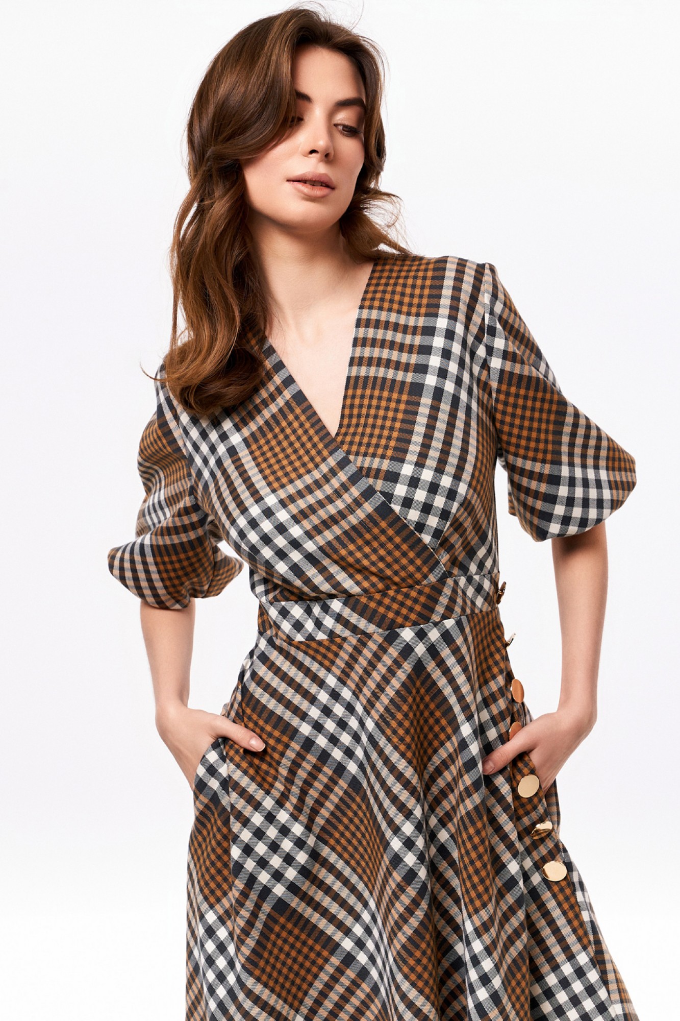 Приталенное платье с расклешённой юбкой длины миди с декоративными пуговицами по боковому шву. Лиф с имитацией запаха. Застёжка на потайную молнию по спинке.