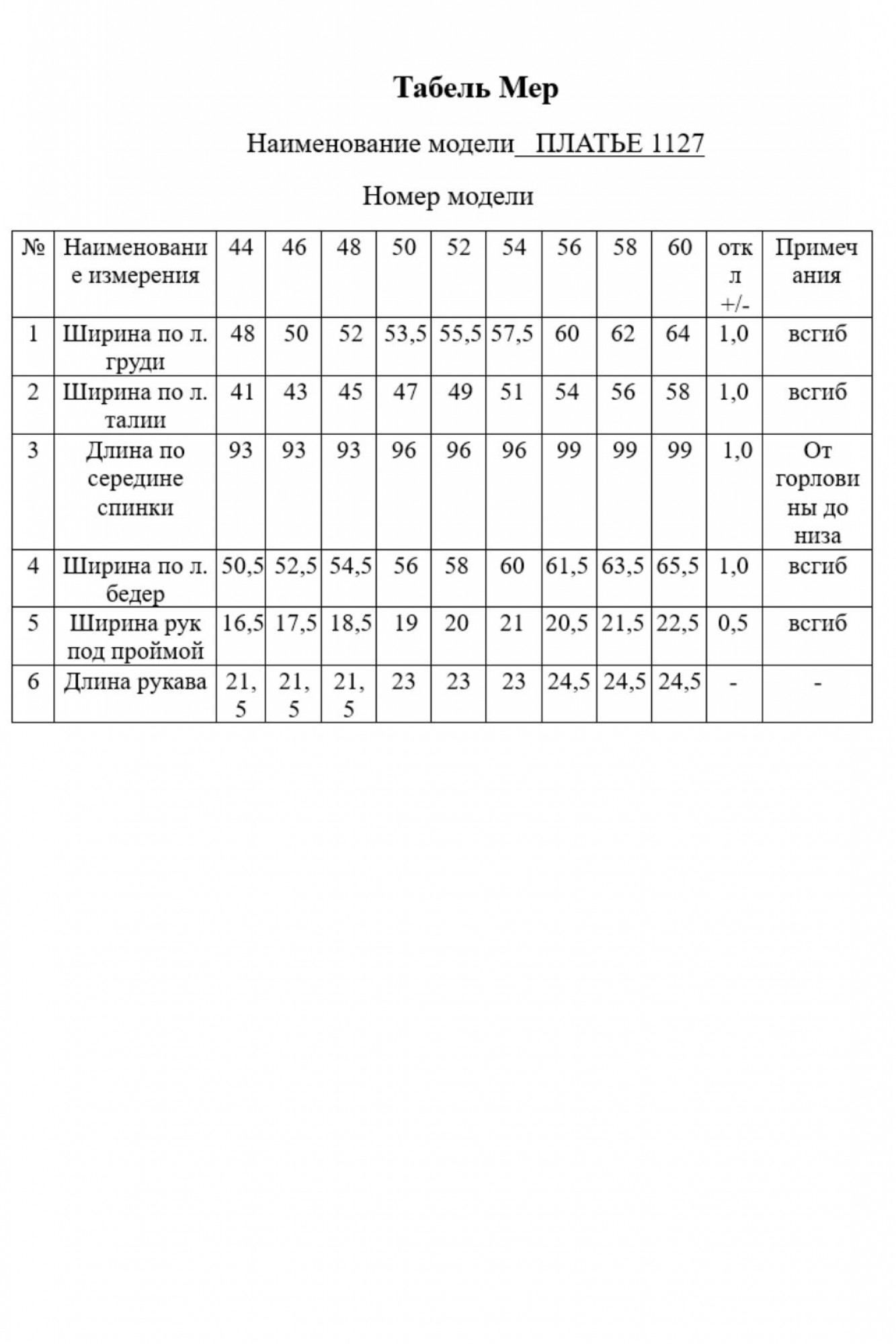 Таблица размеров
