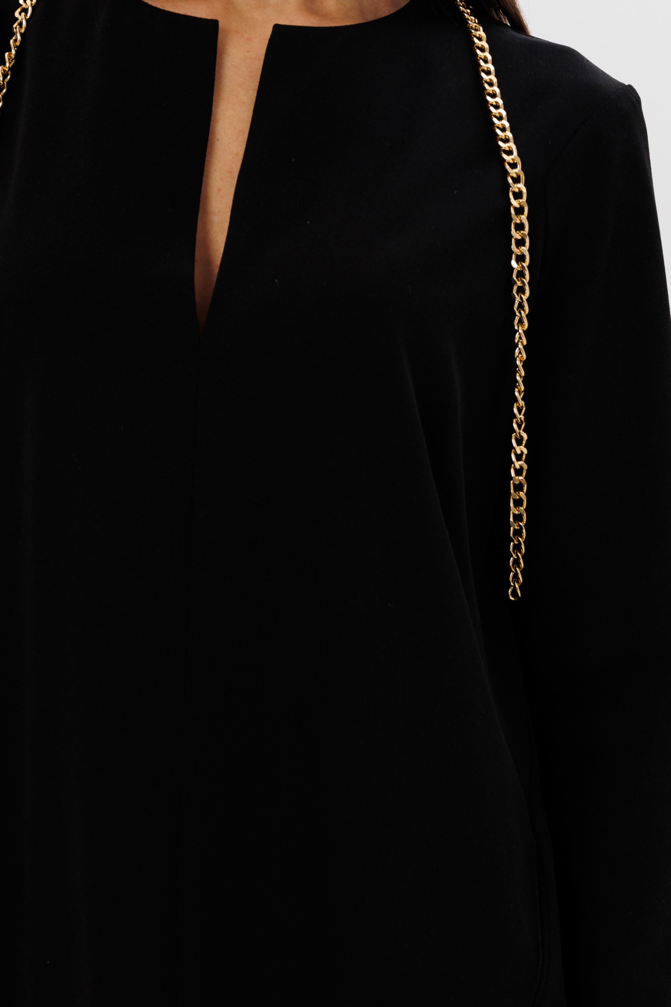 Это платье прямого силуэта — воплощение современного стиля и элегантности. Разрезы по рукавам и рельефам низа добавляют изысканности и динамики, создавая уникальный и привлекательный образ. Карманы, расположенные в рельефах, не только практичны, но и подчёркивают внимание к деталям. Разрез по середине переда придаёт платью смелый и оригинальный акцент. Горловина, отделанная декоративной металлической цепочкой золотого цвета, добавляет нотку роскоши и утончённости, завершая образ с изысканным штрихом. Это платье станет идеальным выбором для особых случаев, подчёркивая вашу индивидуальность и безупречный вкус.