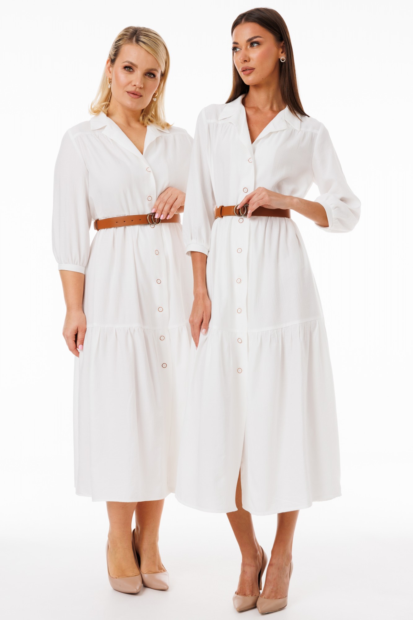 Пуговицы по переду не только выполняют практичную функцию, но и служат стильным акцентом, позволяя регулировать степень открытости платья. В комплекте идет пояс, с помощью которого можно подчеркнуть талию, создавая более структурированный образ.