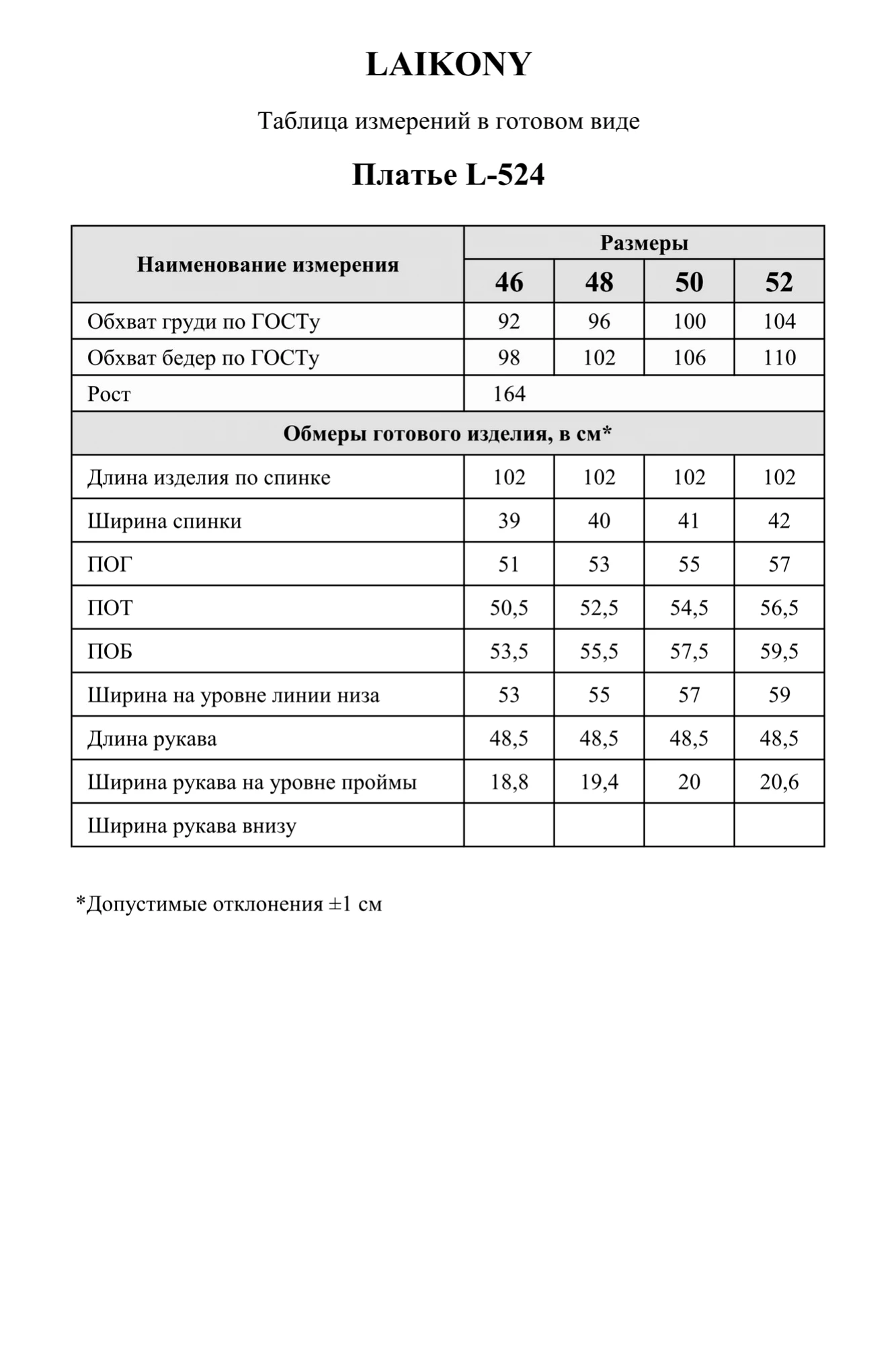 Таблица размеров