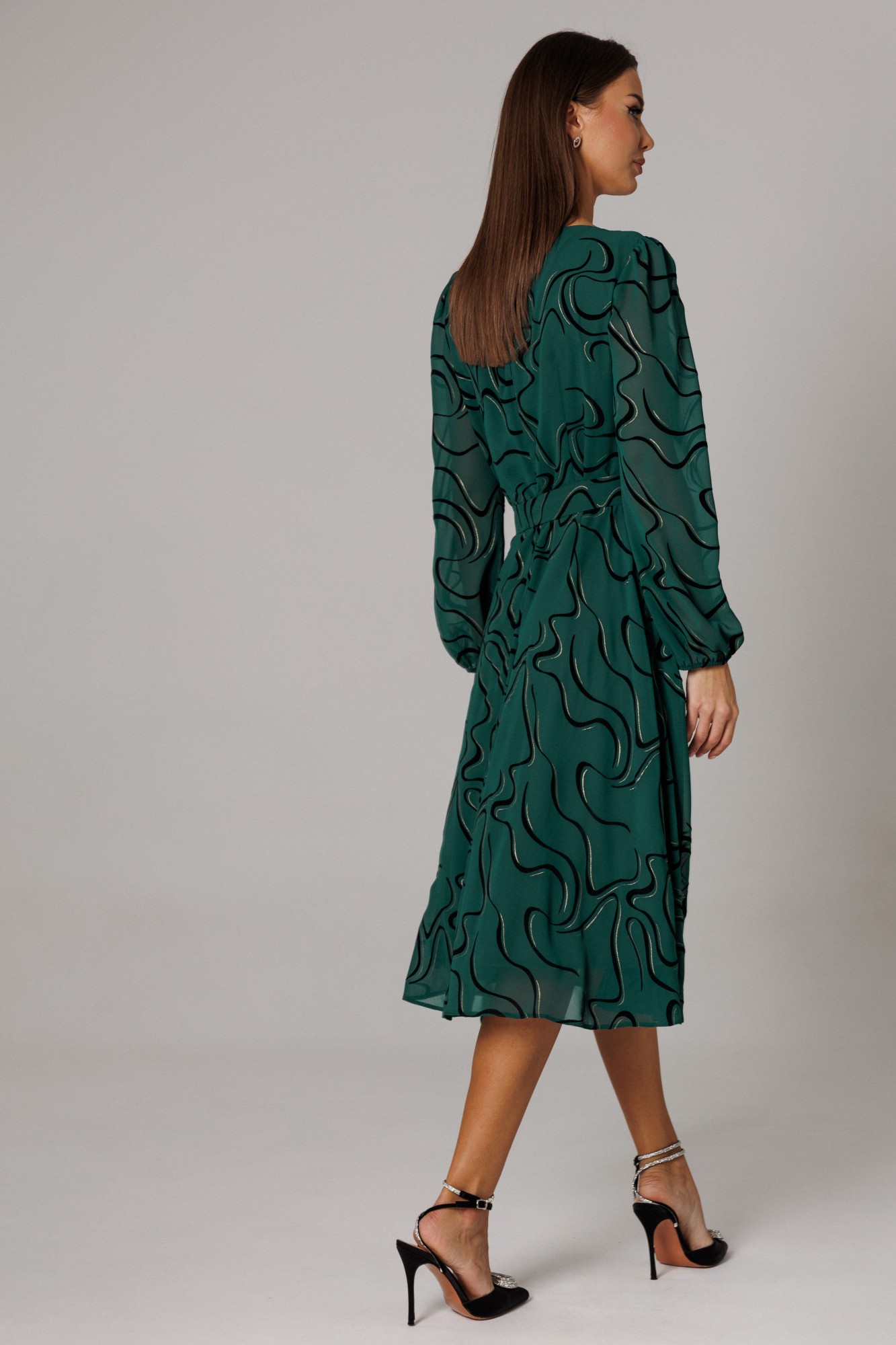 Элегантное платье, отрезное по линии талии из воздушного шифона на подкладке. В верхней части изделия расположены нагрудные горизонтальные вытачки, по спинке и полочке: вертикальные таллиевые. Линия горловины оформлена в форме «лодочка». Нижняя часть платья по крою: «полусолнце». В среднем шве спинке потайная застежка-молния. Рукав втачной, одношовный. По окату и низу рукава-сборка. Чтобы подчеркнуть изящество талии: платье дополнено съемным текстильным поясом, который может быть завязан на бант или классический узел. (фурнитура может отличаться от представленной на рекламном фотоматериале). Особые рекомендации: рекомендуется холодная деликатная ручная стирка, без использования отбеливающих СМС, без интенсивного трения. Сушка в вертикальном положении. ВТО с минимальным паром.