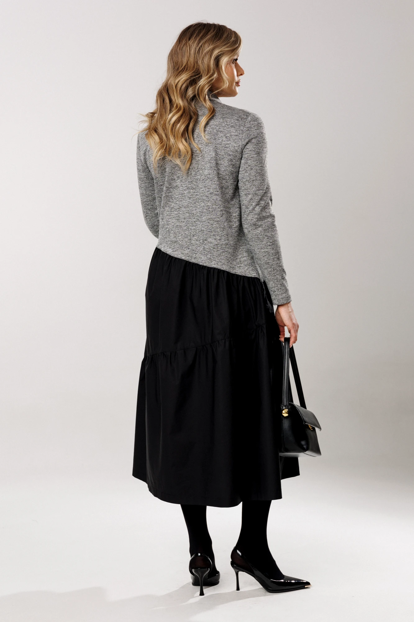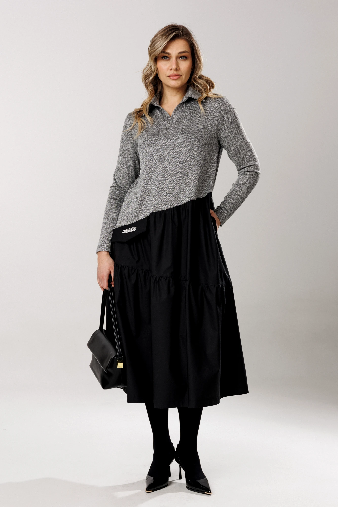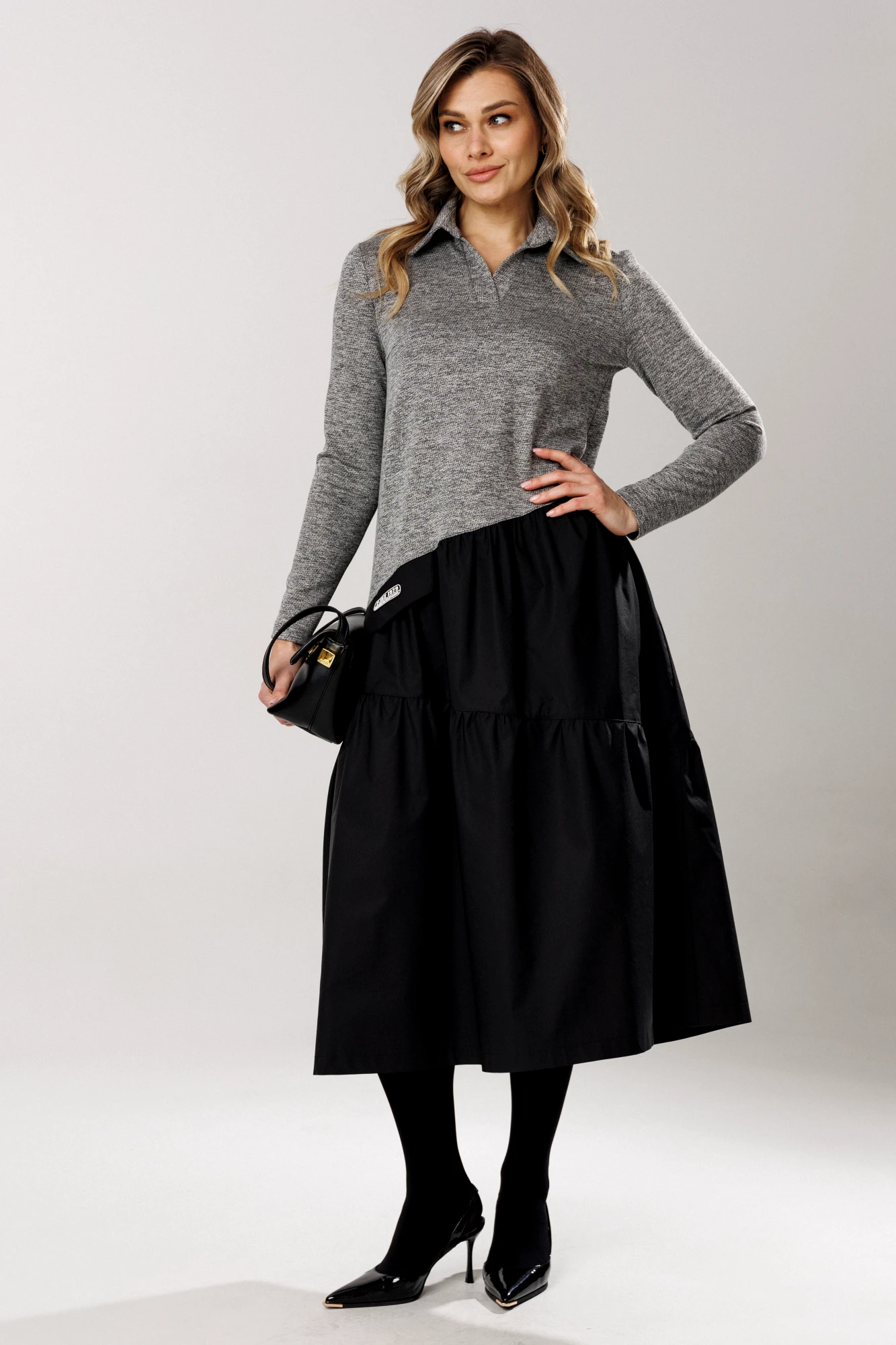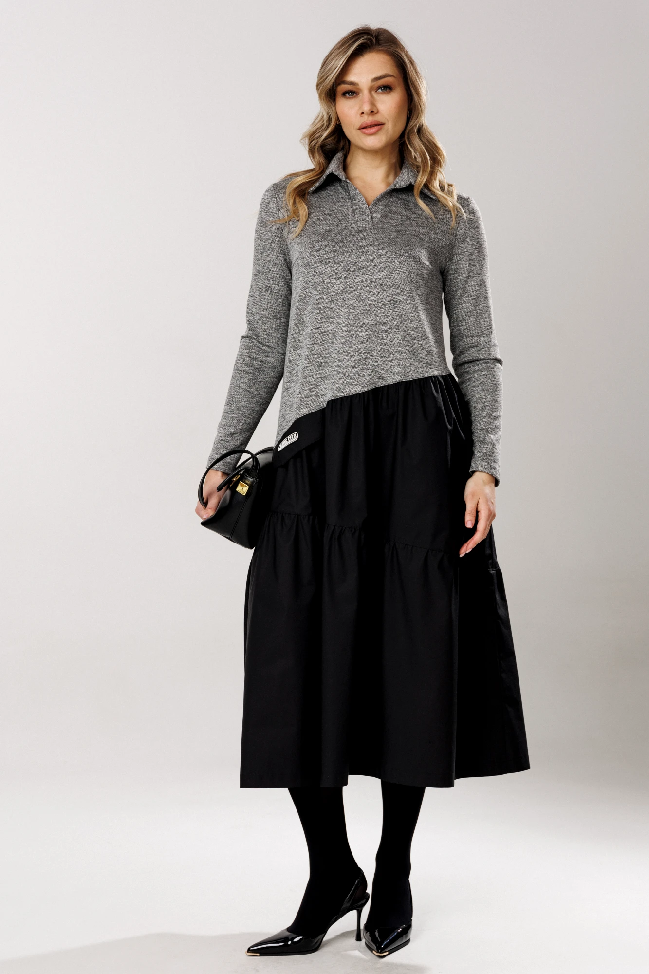 Восхитительное платье свободного А-силуэта с ассиметричным отрезным уклоном по линии талии и притачивания воланов юбки изделия, горловиной в стиле поло. Полочка и спинка платья отрезные по линии талии с ассиметричным уклоном. Верх изделия из трикотажного полотна. Спереди расположены горизонтальные нагрудные вытачки. Горловина платья оформлена V-образным вырезом с заходящими планками и отложным воротником со стойкой, в стиле поло. Глубина выреза 13-14 см. Ширина планок 3 см. Рукав прямой, одношовный, втачной. Линия плеча чуть спущена на 1,5 см. Длина рукава 59-60 см. Длина изделия по спинке 124,126 см (в зависимости от размерного ряда). Юбка платья А-силуэта состоит из двух составных воланов под уклоном на умеренной сборке. На линии соединения талии с юбкой платья с одной стороны переда втачена нефункциональная деталь: клапан с декоративным притачным элементом. В боковом шве юбки расположен внутренний карман. Длина платья по спинке 124-126 см (в зависимости от размерного ряда). (фурнитура может отличаться от представленной на рекламном фотоматериале). Особые рекомендации: рекомендуется холодная деликатная ручная стирка, без использования отбеливающих СМС, без интенсивного трения. Сушка в вертикальном положении. ВТО с минимальным паром.
