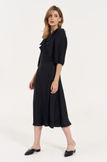 Платье лёгкое, струящееся на запахе. Отрезное по линии талии, расширенное к низу. Воротник выходящий из линии плеча, пиджачного типа, на участке воротника - декоративная перемычка создающая мягкую складку. Рукава одношовные с узкой резинкой по низу и сборкой по окату. Длина рукава до линии локтя. Застежка внешней части переда на потайную кнопку, внутренней части переда на завязку. В боковых швах карманы. Особенностью платья платья является обработка всех внутренних швов платья окантовкой, что придает изделию элитный вид.