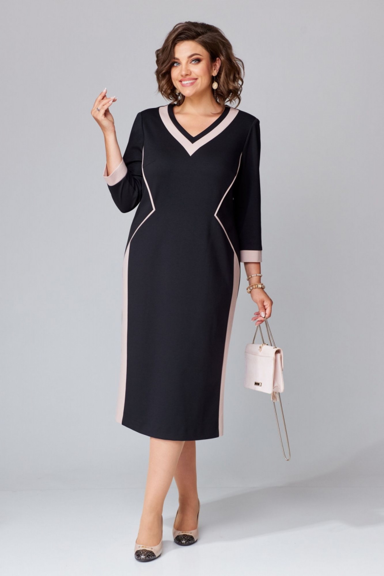 Платье полуприлегающего силуэта с V- образным вырезом горловины, без подкладки. По переду декоративные вставки из отделочной ткани. Спинка со средним швом. Рукав втачной одношовный с манжетой по низу.