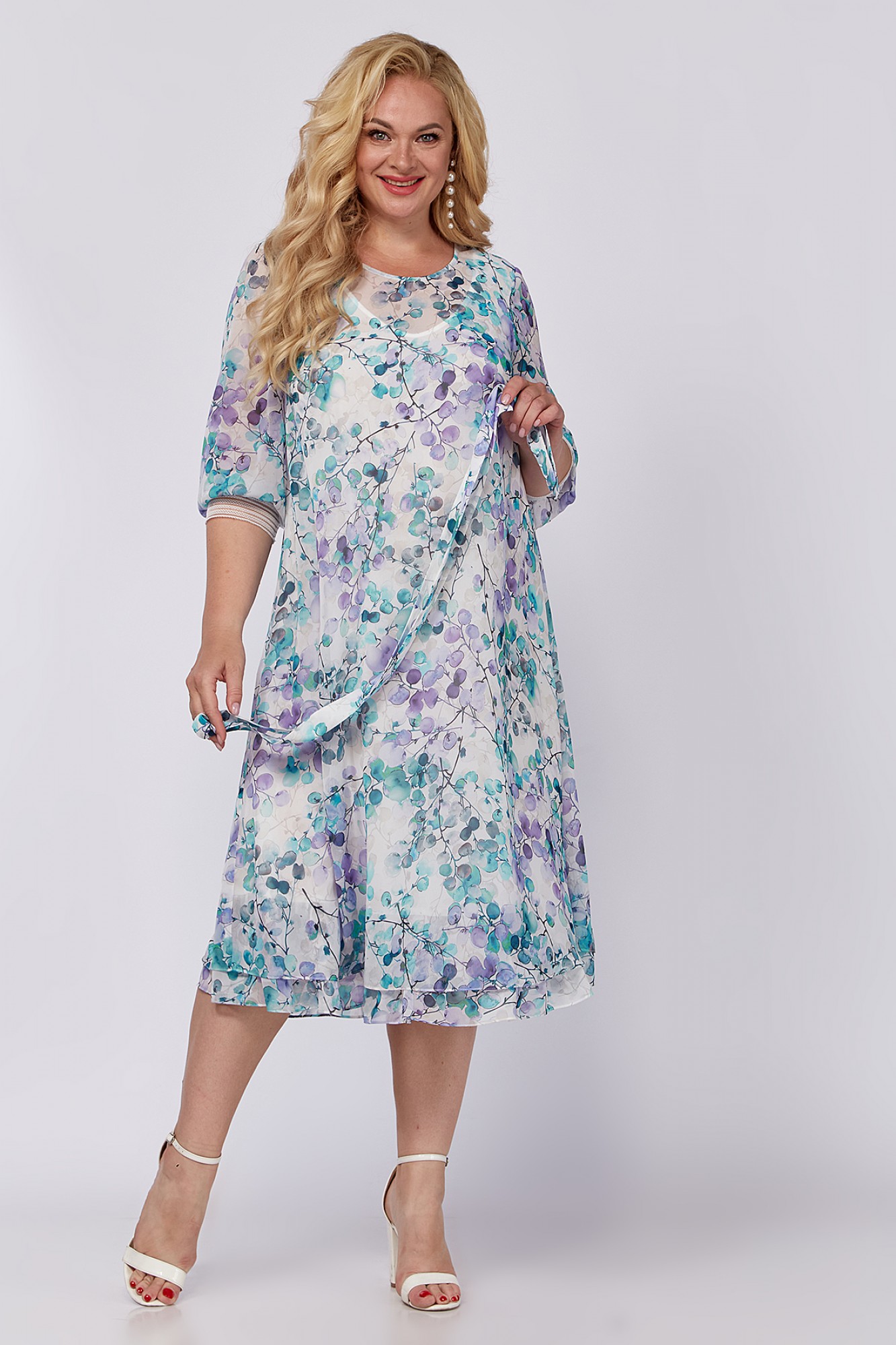 Эффектное платье из шифоновой ткани. Горловина овальной формы, нагрудные вытачки направлены от бокового шва к центру груди, спинка со средним швом и каплевидной застежкой на пуговице. Низ платья обрамляет волан, наполняя образ воздушной многослойностью. Рукав втачной, одношовный, низ рукава собран на эластичную декоративную тесьму. Платье на трикотажной подкладке. Нарядное платье, в котором Вы будете выглядеть женственно и романтично. Платье скроет все неровности фигуры! К платью прилагается съемный пояс. Платье выручит при выходе по любому случаю.