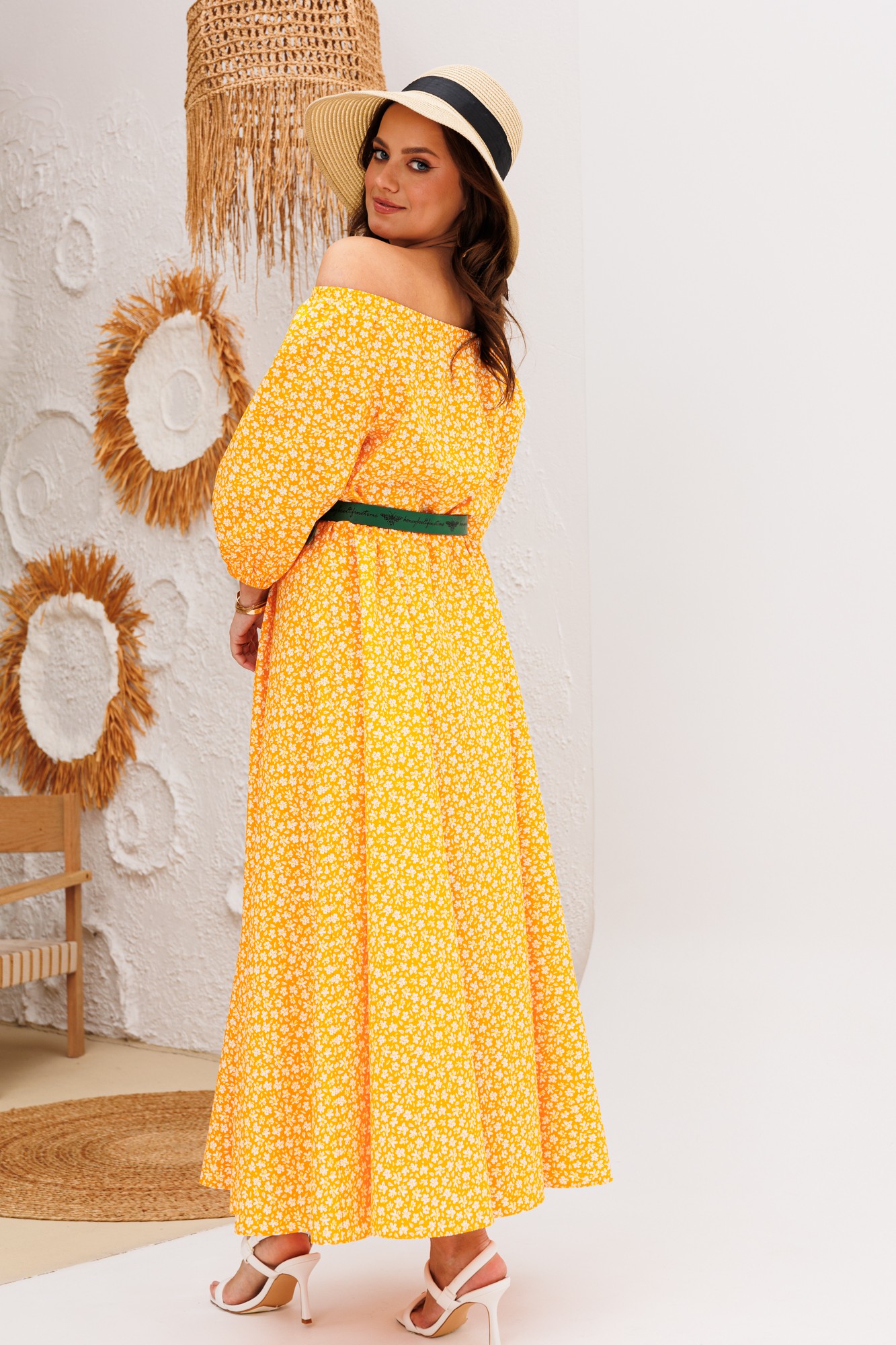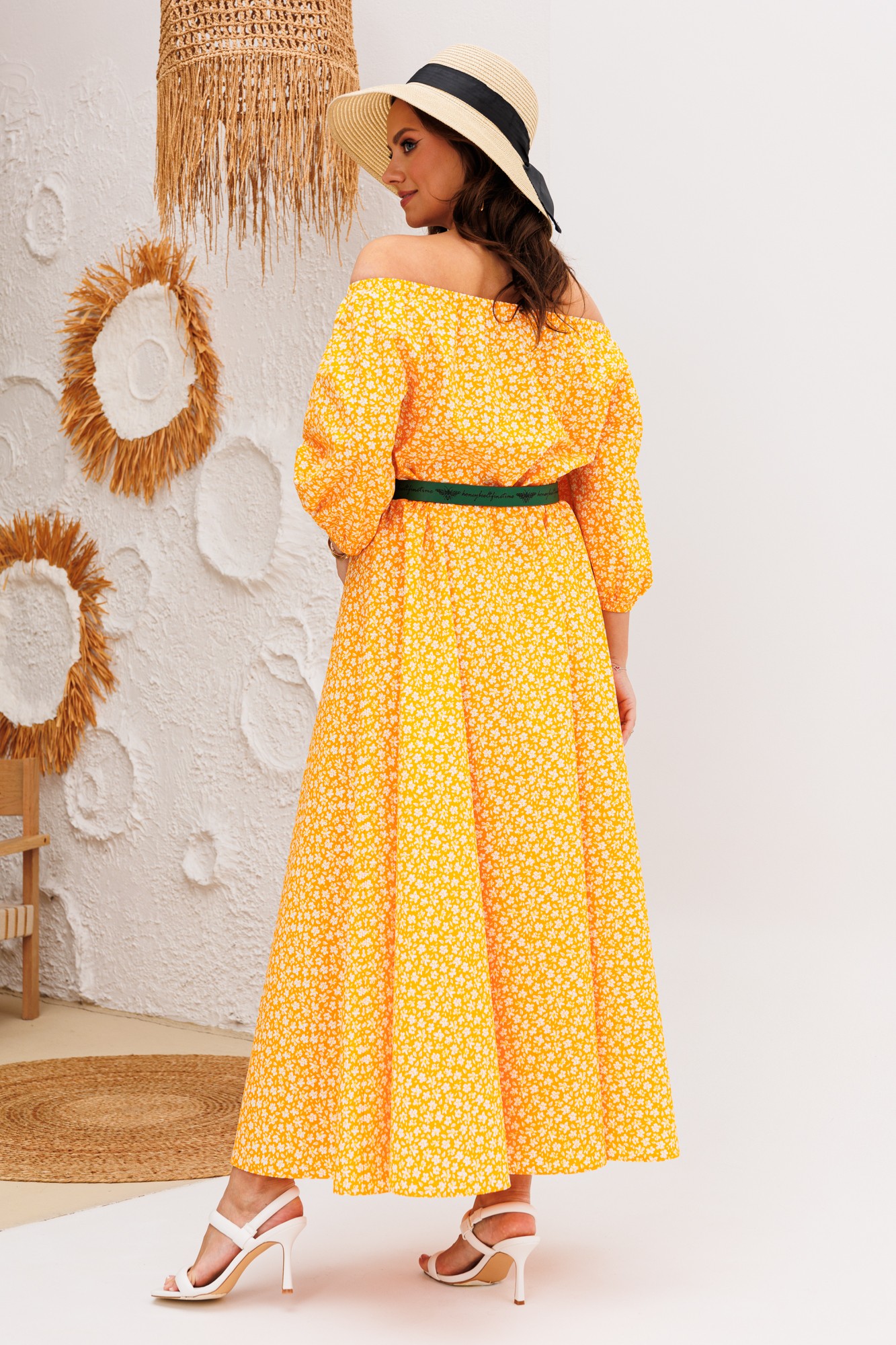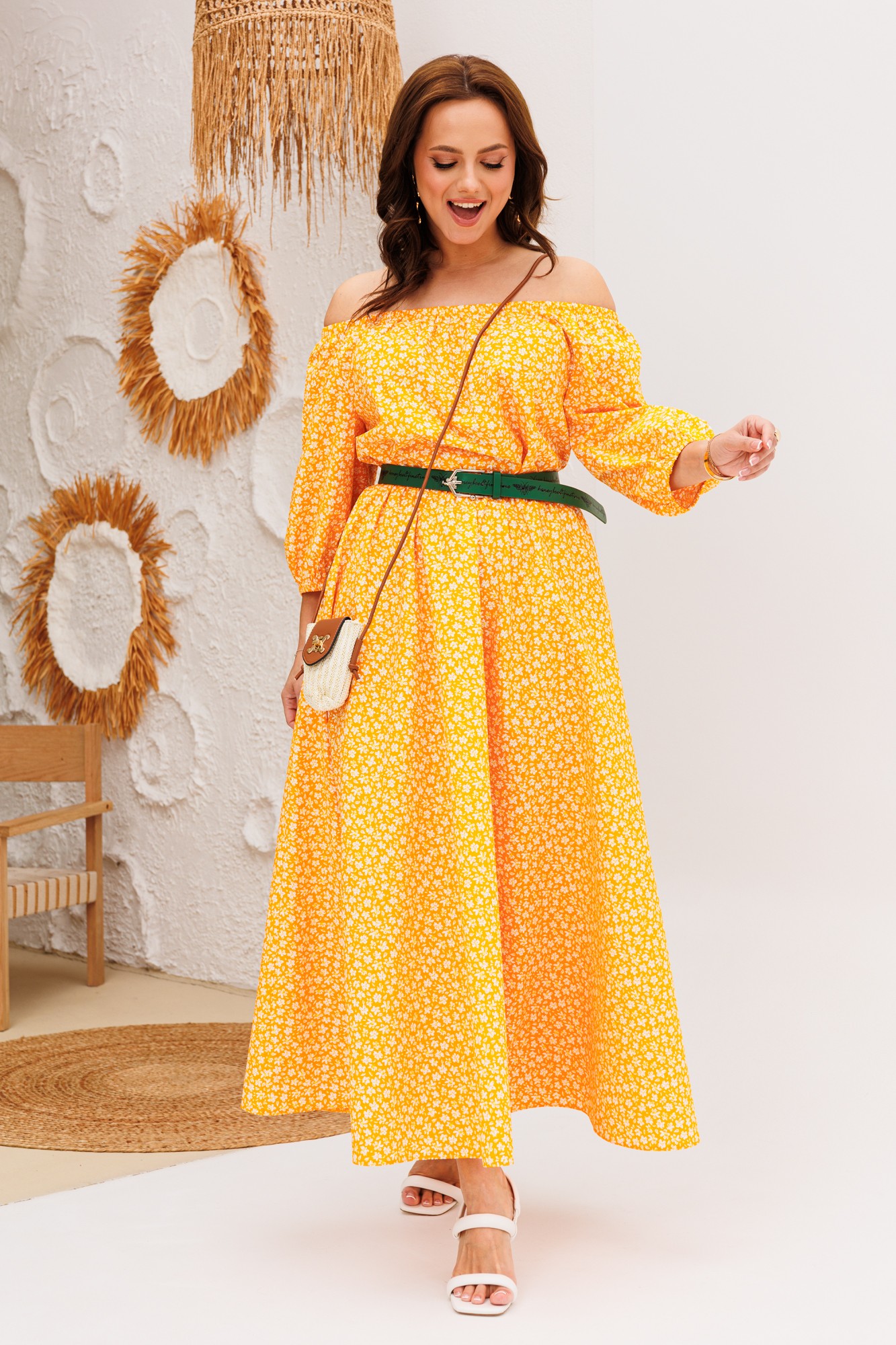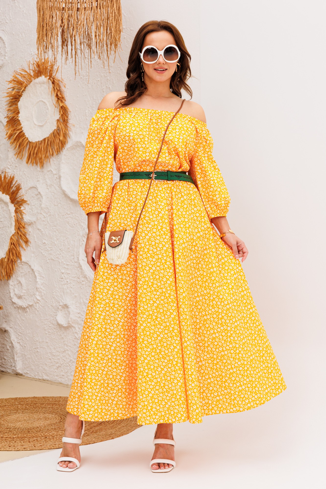 Платье свободного силуэта с открытыми плечами из хлопковой ткани. Рукав реглан 3/4 длины, низ на резинке. Горловина собрана на резинку. Платье отрезное по линии талии, на резинке. Юбка полусолнце. В комплект входит съемный пояс.