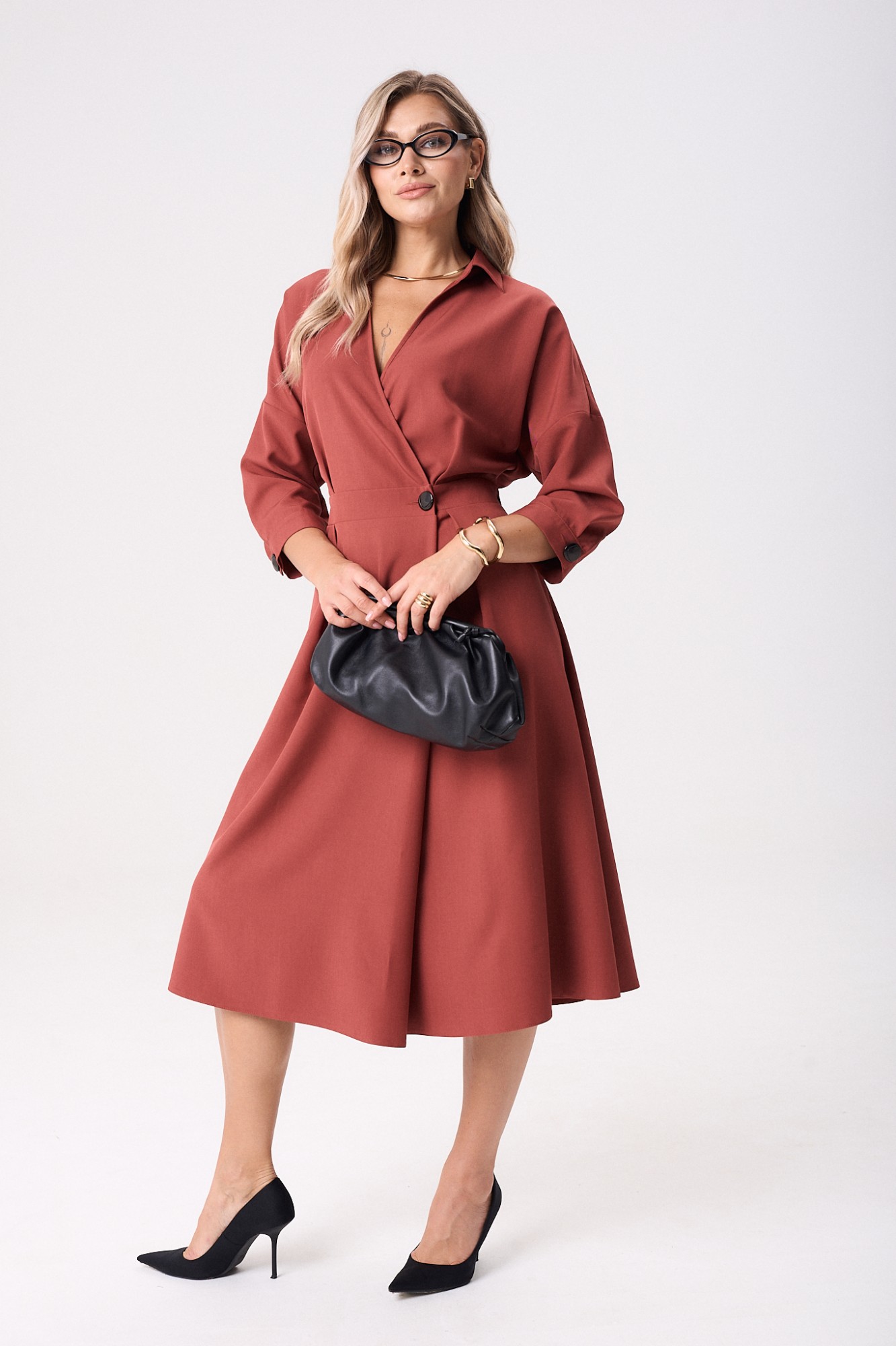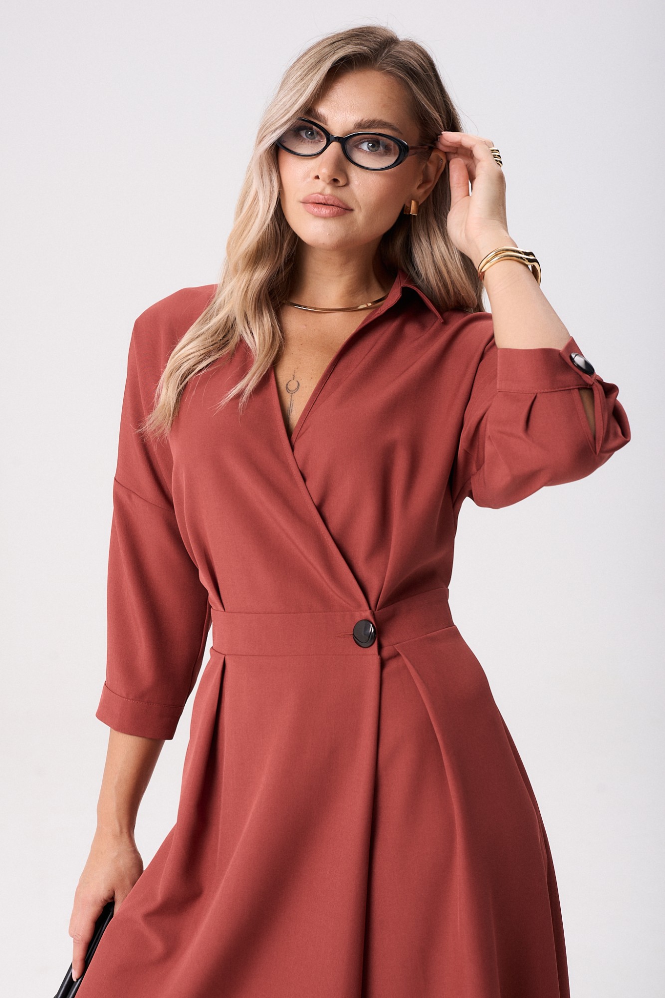 Элегантное женское платье из костюмной ткани необычного кроя станет изюминкой вашего гардероба. Платье полуприлегающего силуэта, отрезное по линии талии со спущенным плечом. Рукав 3/4 длинный на отрезной манжете. По полочке идут защипы-складки в верхней и нижней частях, запах - на петли и пуговицы по подрезу. По нижней части платья запах идет в виде складки. По спинке кокетка со складкой, по подрезу вставлена резинка. Юбка-полусолнце с односторонними складками по полочке, по бокам карманы. По горловине воротник на отрезной стойке. Платье будет идеально смотреться с туфлями, ботинками и сапогами.