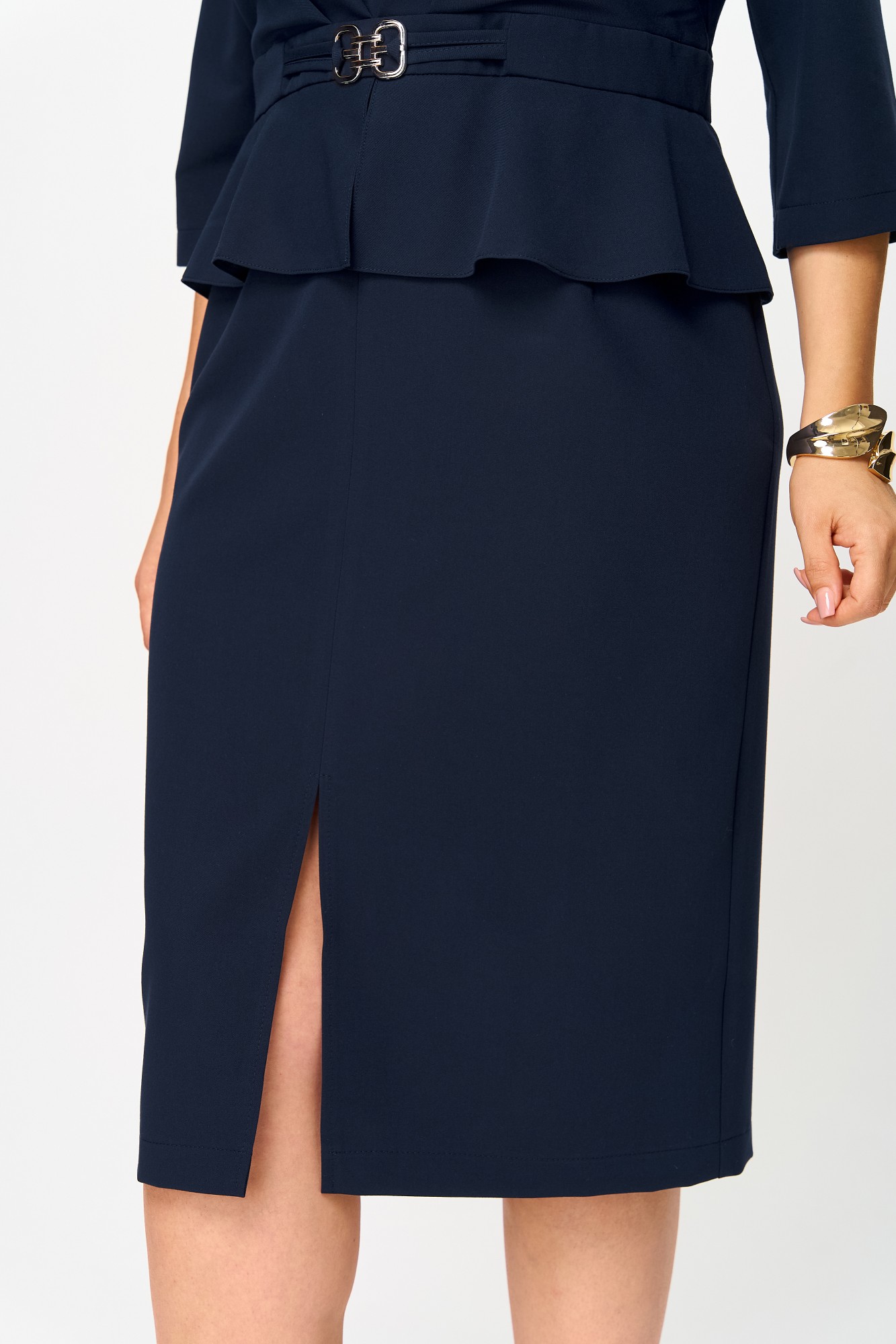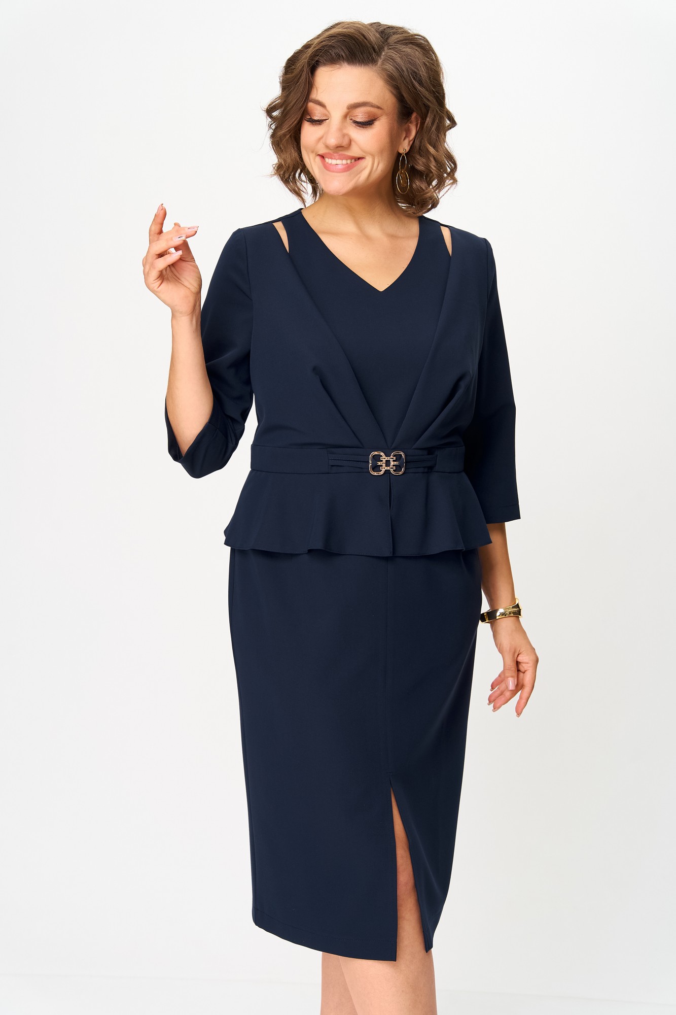Платье полуприлегающего силуэта, длиной за колено, выполнено из однотонной ткани. Платье с отрезным лифом, полочка лифа с рельефами, горловиной V-образной формы и отлетной частью полочки со складкой по шву притачивания к поясу. Спинка лифа с вертикальными рельефами и центральным швом с потайной молнией. Юбка платья прилегающая по бедрам с таллиевыми вытачками и разрезом в среднем шве передней половинки юбки. Между лифом и юбкой обработан пояс с декоративным элементом в виде пряжки и баской.