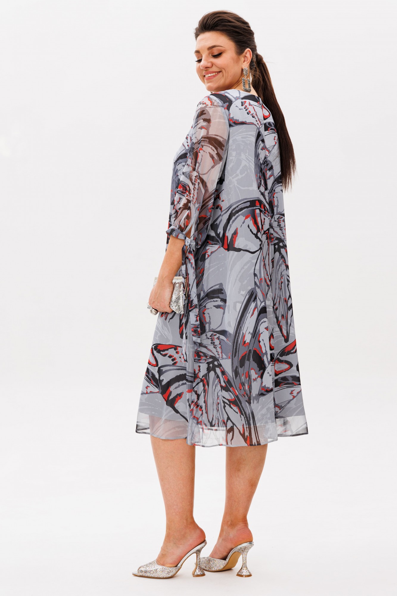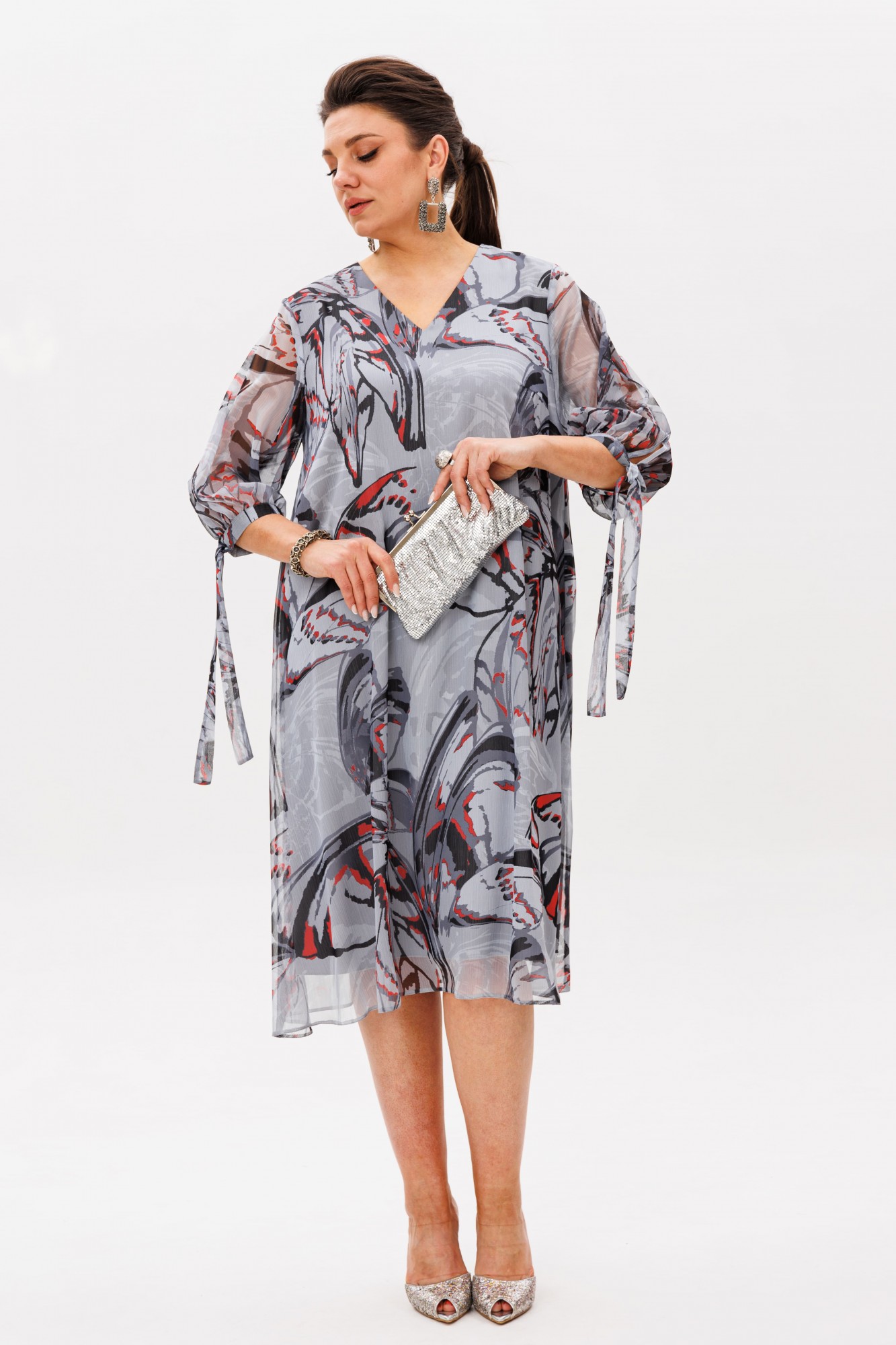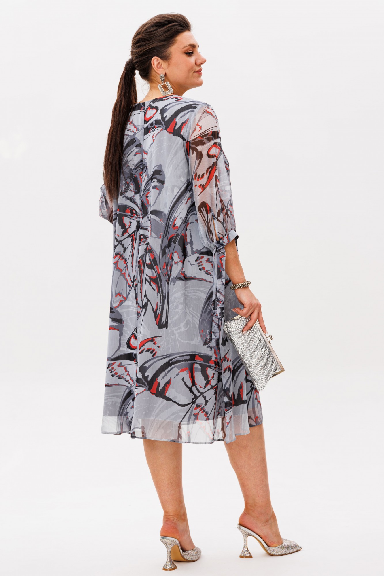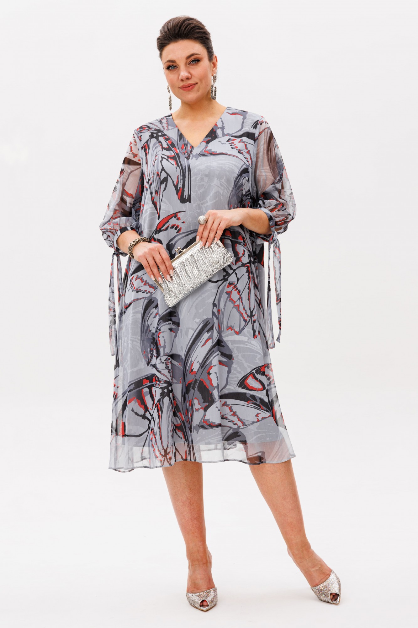 Втачной рукав три четверти мягко облегает руку, а манжеты на завязках с игривыми бантами придают образу очаровательную нежность. Шифон в цвете «красные бабочки» лёгкий и текучий, играет бликами при каждом движении.