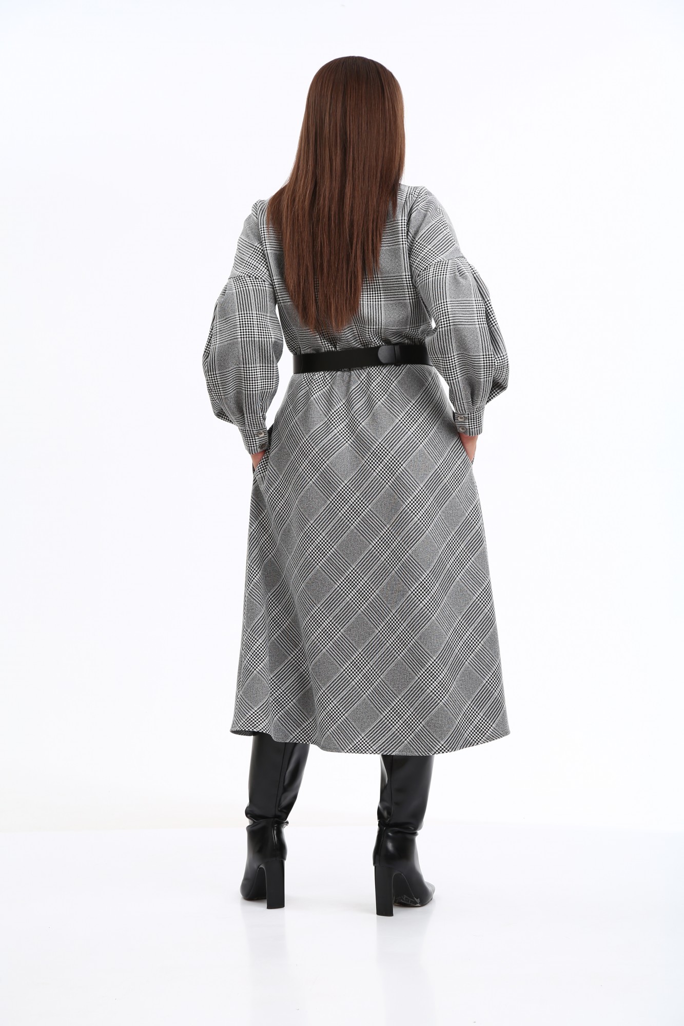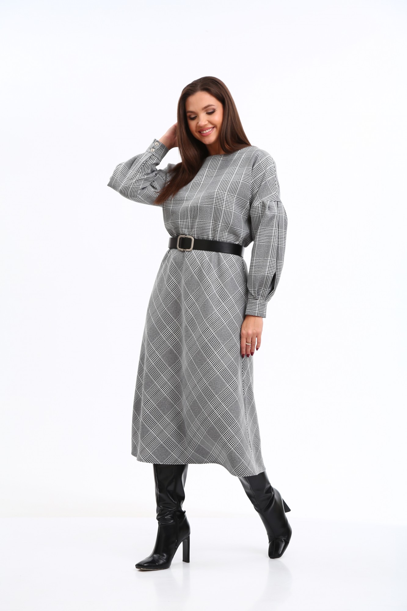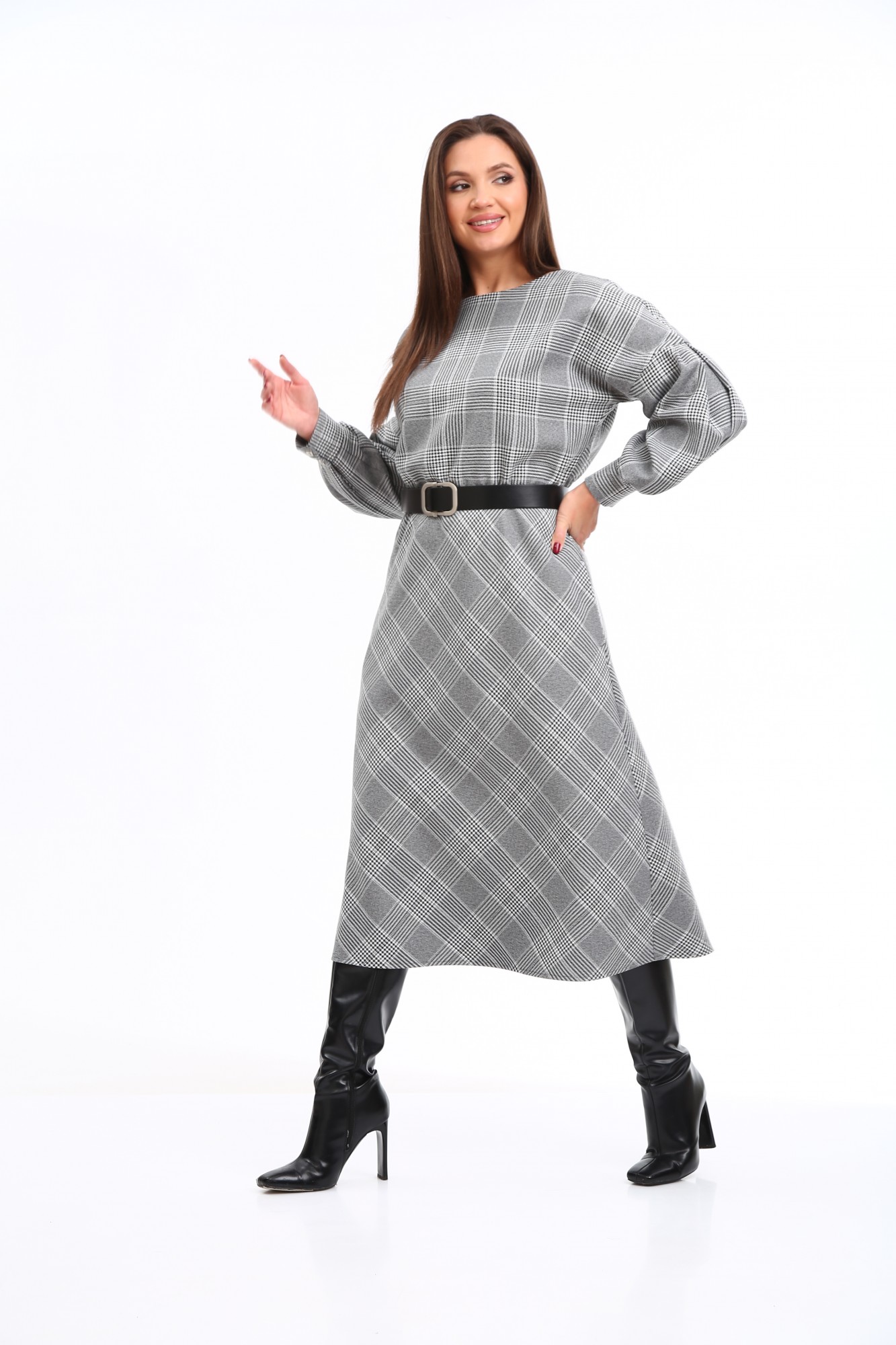 Стильное платье в клетку в трендовой расцветке, безусловно, станет фаворитом в Вашем гардеробе. Изделие выполнено из высококачественной ткани, приятной к телу. Платье А-образного силуэта, отрезное по линии талии. Рукава спущенные с активными защипами, полной длины, с притачными манжетами с застежкой на петли-пуговицы. Горловина мягкой округлой формы. Нижняя часть платья покроя трапеция. В боковых швах предусмотрены функциональные карманы. В области талии платье присобрано на эластичную тесьму. Платье дополнено стильным съёмным ремнем. Данное изделие легко можно использовать в повседневной жизни – оно также идеально впишется в деловой образ современной женщины.